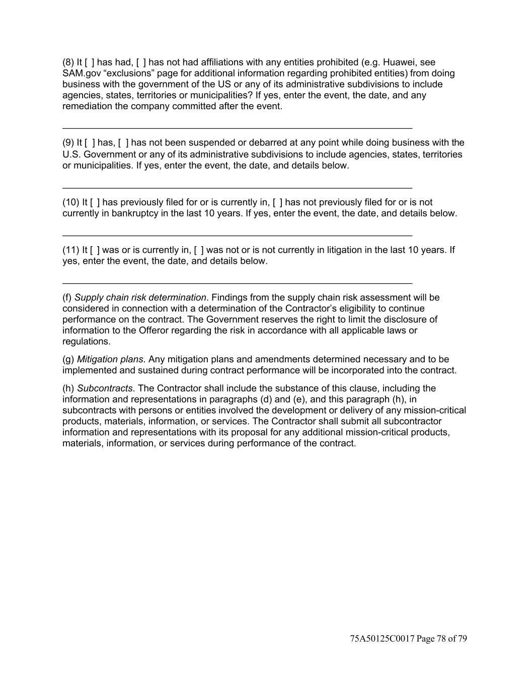 75A50125C0017 Page 78 of 79 (8) It [ ] has had, [ ] has not had affiliations with any entities prohibited (e.g. Huawei, see SAM.gov “exclusions” page for additional information regarding prohibited entities) from doing business with the government of the US or any of its administrative subdivisions to include agencies, states, territories or municipalities? If yes, enter the event, the date, and any remediation the company committed after the event. (9) It [ ] has, [ ] has not been suspended or debarred at any point while doing business with the U.S. Government or any of its administrative subdivisions to include agencies, states, territories or municipalities. If yes, enter the event, the date, and details below. (10) It [ ] has previously filed for or is currently in, [ ] has not previously filed for or is not currently in bankruptcy in the last 10 years. If yes, enter the event, the date, and details below. (11) It [ ] was or is currently in, [ ] was not or is not currently in litigation in the last 10 years. If yes, enter the event, the date, and details below. (f) Supply chain risk determination. Findings from the supply chain risk assessment will be considered in connection with a determination of the Contractor’s eligibility to continue performance on the contract. The Government reserves the right to limit the disclosure of information to the Offeror regarding the risk in accordance with all applicable laws or regulations. (g) Mitigation plans. Any mitigation plans and amendments determined necessary and to be implemented and sustained during contract performance will be incorporated into the contract. (h) Subcontracts. The Contractor shall include the substance of this clause, including the information and representations in paragraphs (d) and (e), and this paragraph (h), in subcontracts with persons or entities involved the development or delivery of any mission-critical products, materials, information, or services. The Contractor shall submit all subcontractor information and representations with its proposal for any additional mission-critical products, materials, information, or services during performance of the contract.