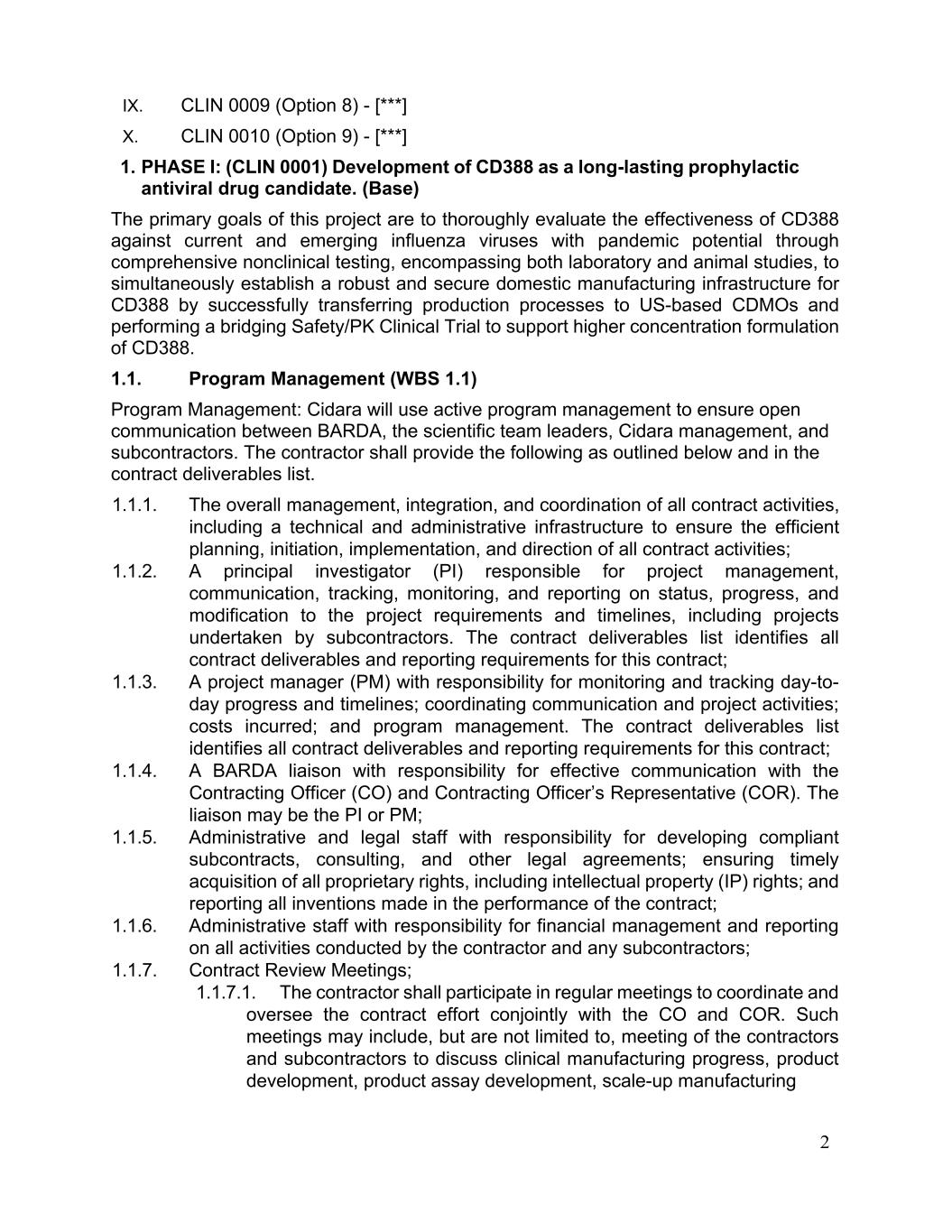 2 IX. CLIN 0009 (Option 8) - [***] X. CLIN 0010 (Option 9) - [***] 1. PHASE I: (CLIN 0001) Development of CD388 as a long-lasting prophylactic antiviral drug candidate. (Base) The primary goals of this project are to thoroughly evaluate the effectiveness of CD388 against current and emerging influenza viruses with pandemic potential through comprehensive nonclinical testing, encompassing both laboratory and animal studies, to simultaneously establish a robust and secure domestic manufacturing infrastructure for CD388 by successfully transferring production processes to US-based CDMOs and performing a bridging Safety/PK Clinical Trial to support higher concentration formulation of CD388. 1.1. Program Management (WBS 1.1) Program Management: Cidara will use active program management to ensure open communication between BARDA, the scientific team leaders, Cidara management, and subcontractors. The contractor shall provide the following as outlined below and in the contract deliverables list. 1.1.1. The overall management, integration, and coordination of all contract activities, including a technical and administrative infrastructure to ensure the efficient planning, initiation, implementation, and direction of all contract activities; 1.1.2. A principal investigator (PI) responsible for project management, communication, tracking, monitoring, and reporting on status, progress, and modification to the project requirements and timelines, including projects undertaken by subcontractors. The contract deliverables list identifies all contract deliverables and reporting requirements for this contract; 1.1.3. A project manager (PM) with responsibility for monitoring and tracking day-to- day progress and timelines; coordinating communication and project activities; costs incurred; and program management. The contract deliverables list identifies all contract deliverables and reporting requirements for this contract; 1.1.4. A BARDA liaison with responsibility for effective communication with the Contracting Officer (CO) and Contracting Officer’s Representative (COR). The liaison may be the PI or PM; 1.1.5. Administrative and legal staff with responsibility for developing compliant subcontracts, consulting, and other legal agreements; ensuring timely acquisition of all proprietary rights, including intellectual property (IP) rights; and reporting all inventions made in the performance of the contract; 1.1.6. Administrative staff with responsibility for financial management and reporting on all activities conducted by the contractor and any subcontractors; 1.1.7. Contract Review Meetings; 1.1.7.1. The contractor shall participate in regular meetings to coordinate and oversee the contract effort conjointly with the CO and COR. Such meetings may include, but are not limited to, meeting of the contractors and subcontractors to discuss clinical manufacturing progress, product development, product assay development, scale-up manufacturing