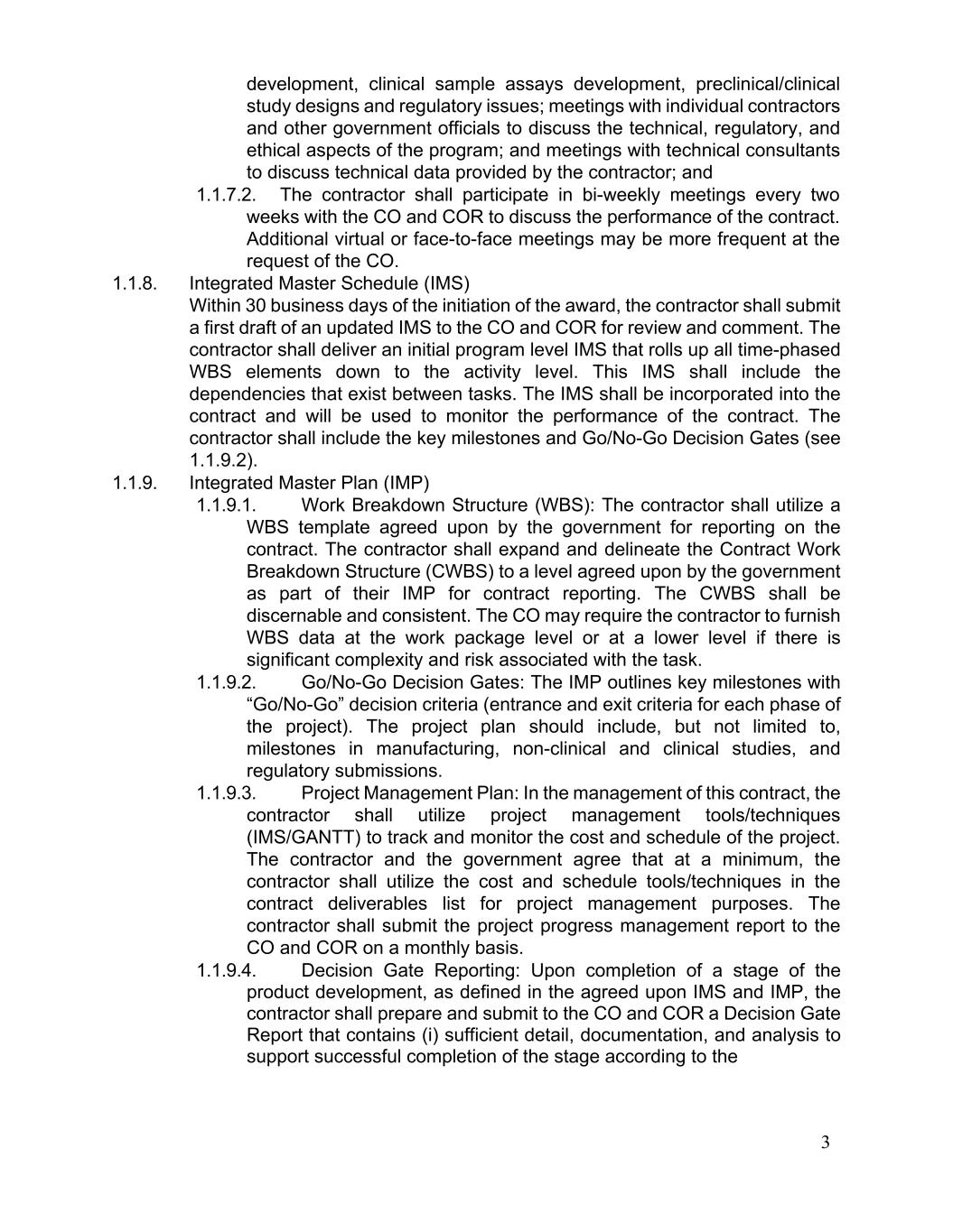 3 development, clinical sample assays development, preclinical/clinical study designs and regulatory issues; meetings with individual contractors and other government officials to discuss the technical, regulatory, and ethical aspects of the program; and meetings with technical consultants to discuss technical data provided by the contractor; and 1.1.7.2. The contractor shall participate in bi-weekly meetings every two weeks with the CO and COR to discuss the performance of the contract. Additional virtual or face-to-face meetings may be more frequent at the request of the CO. 1.1.8. Integrated Master Schedule (IMS) Within 30 business days of the initiation of the award, the contractor shall submit a first draft of an updated IMS to the CO and COR for review and comment. The contractor shall deliver an initial program level IMS that rolls up all time-phased WBS elements down to the activity level. This IMS shall include the dependencies that exist between tasks. The IMS shall be incorporated into the contract and will be used to monitor the performance of the contract. The contractor shall include the key milestones and Go/No-Go Decision Gates (see 1.1.9.2). 1.1.9. Integrated Master Plan (IMP) 1.1.9.1. Work Breakdown Structure (WBS): The contractor shall utilize a WBS template agreed upon by the government for reporting on the contract. The contractor shall expand and delineate the Contract Work Breakdown Structure (CWBS) to a level agreed upon by the government as part of their IMP for contract reporting. The CWBS shall be discernable and consistent. The CO may require the contractor to furnish WBS data at the work package level or at a lower level if there is significant complexity and risk associated with the task. 1.1.9.2. Go/No-Go Decision Gates: The IMP outlines key milestones with “Go/No-Go” decision criteria (entrance and exit criteria for each phase of the project). The project plan should include, but not limited to, milestones in manufacturing, non-clinical and clinical studies, and regulatory submissions. 1.1.9.3. Project Management Plan: In the management of this contract, the contractor shall utilize project management tools/techniques (IMS/GANTT) to track and monitor the cost and schedule of the project. The contractor and the government agree that at a minimum, the contractor shall utilize the cost and schedule tools/techniques in the contract deliverables list for project management purposes. The contractor shall submit the project progress management report to the CO and COR on a monthly basis. 1.1.9.4. Decision Gate Reporting: Upon completion of a stage of the product development, as defined in the agreed upon IMS and IMP, the contractor shall prepare and submit to the CO and COR a Decision Gate Report that contains (i) sufficient detail, documentation, and analysis to support successful completion of the stage according to the