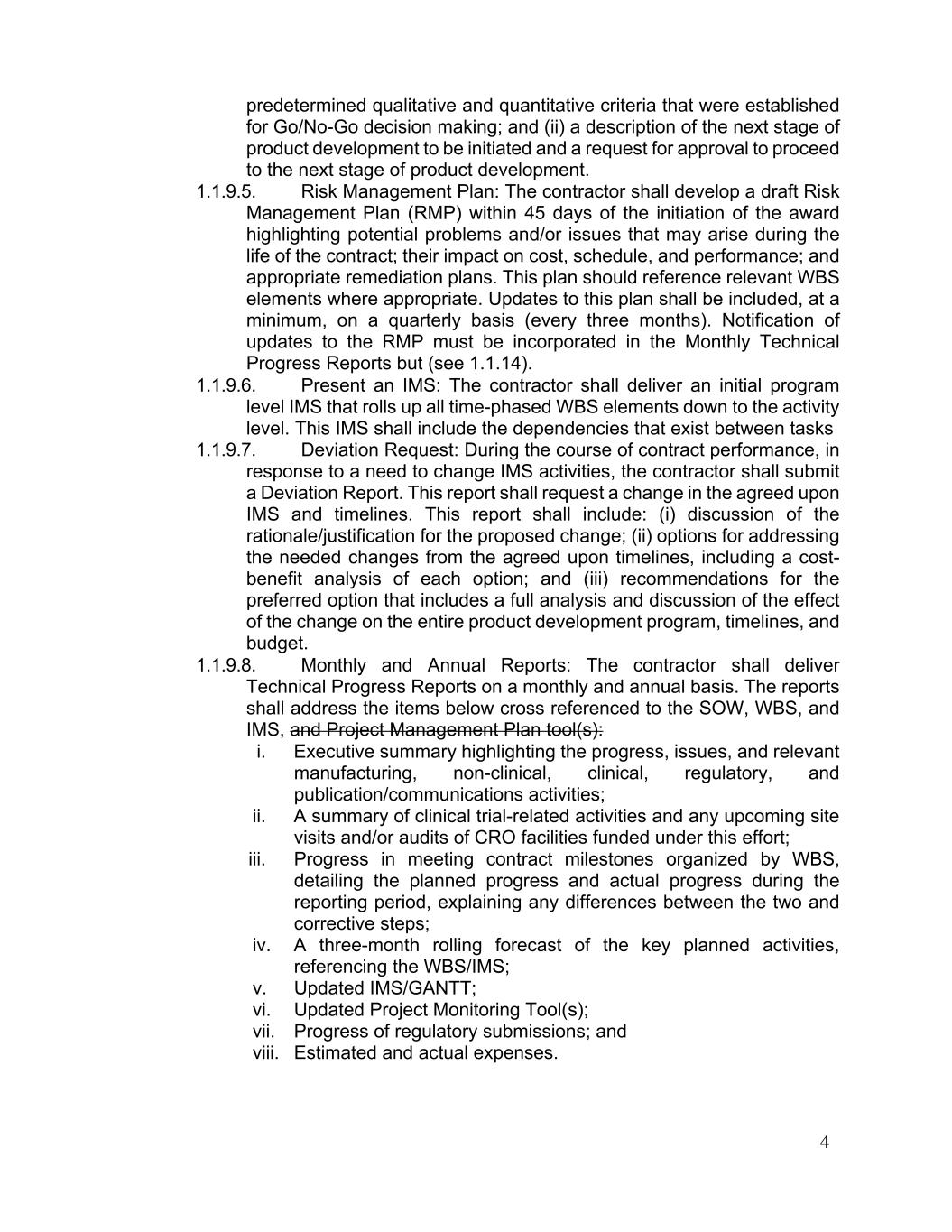 4 predetermined qualitative and quantitative criteria that were established for Go/No-Go decision making; and (ii) a description of the next stage of product development to be initiated and a request for approval to proceed to the next stage of product development. 1.1.9.5. Risk Management Plan: The contractor shall develop a draft Risk Management Plan (RMP) within 45 days of the initiation of the award highlighting potential problems and/or issues that may arise during the life of the contract; their impact on cost, schedule, and performance; and appropriate remediation plans. This plan should reference relevant WBS elements where appropriate. Updates to this plan shall be included, at a minimum, on a quarterly basis (every three months). Notification of updates to the RMP must be incorporated in the Monthly Technical Progress Reports but (see 1.1.14). 1.1.9.6. Present an IMS: The contractor shall deliver an initial program level IMS that rolls up all time-phased WBS elements down to the activity level. This IMS shall include the dependencies that exist between tasks 1.1.9.7. Deviation Request: During the course of contract performance, in response to a need to change IMS activities, the contractor shall submit a Deviation Report. This report shall request a change in the agreed upon IMS and timelines. This report shall include: (i) discussion of the rationale/justification for the proposed change; (ii) options for addressing the needed changes from the agreed upon timelines, including a cost- benefit analysis of each option; and (iii) recommendations for the preferred option that includes a full analysis and discussion of the effect of the change on the entire product development program, timelines, and budget. 1.1.9.8. Monthly and Annual Reports: The contractor shall deliver Technical Progress Reports on a monthly and annual basis. The reports shall address the items below cross referenced to the SOW, WBS, and IMS, and Project Management Plan tool(s): i. Executive summary highlighting the progress, issues, and relevant manufacturing, non-clinical, clinical, regulatory, and publication/communications activities; ii. A summary of clinical trial-related activities and any upcoming site visits and/or audits of CRO facilities funded under this effort; iii. Progress in meeting contract milestones organized by WBS, detailing the planned progress and actual progress during the reporting period, explaining any differences between the two and corrective steps; iv. A three-month rolling forecast of the key planned activities, referencing the WBS/IMS; v. Updated IMS/GANTT; vi. Updated Project Monitoring Tool(s); vii. Progress of regulatory submissions; and viii. Estimated and actual expenses.