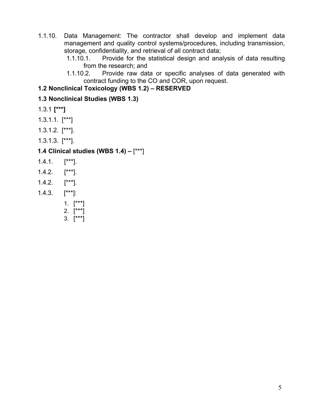 5 1.1.10. Data Management: The contractor shall develop and implement data management and quality control systems/procedures, including transmission, storage, confidentiality, and retrieval of all contract data; 1.1.10.1. Provide for the statistical design and analysis of data resulting from the research; and 1.1.10.2. Provide raw data or specific analyses of data generated with contract funding to the CO and COR, upon request. 1.2 Nonclinical Toxicology (WBS 1.2) – RESERVED 1.3 Nonclinical Studies (WBS 1.3) 1.3.1 [***] 1.3.1.1. [***] 1.3.1.2. [***]. 1.3.1.3. [***]. 1.4 Clinical studies (WBS 1.4) – [***] 1.4.1. [***]. 1.4.2. [***]. 1.4.2. [***]. 1.4.3. [***]: 1. [***] 2. [***] 3. [***]