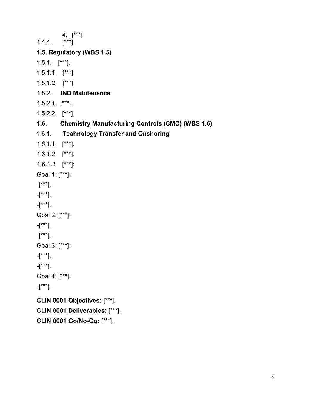 6 4. [***] 1.4.4. [***]. 1.5. Regulatory (WBS 1.5) 1.5.1. [***]. 1.5.1.1. [***] 1.5.1.2. [***] 1.5.2. IND Maintenance 1.5.2.1. [***]. 1.5.2.2. [***]. 1.6. Chemistry Manufacturing Controls (CMC) (WBS 1.6) 1.6.1. Technology Transfer and Onshoring 1.6.1.1. [***]. 1.6.1.2. [***]. 1.6.1.3 [***]: Goal 1: [***]: -[***]. -[***]. -[***]. Goal 2: [***]: -[***]. -[***]. Goal 3: [***]: -[***]. -[***]. Goal 4: [***]: -[***]. CLIN 0001 Objectives: [***]. CLIN 0001 Deliverables: [***]. CLIN 0001 Go/No-Go: [***].