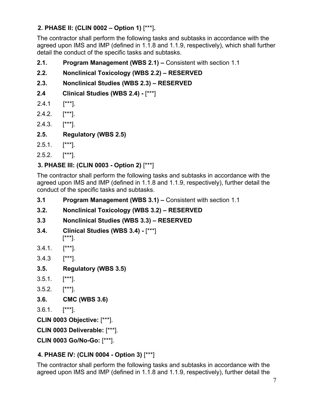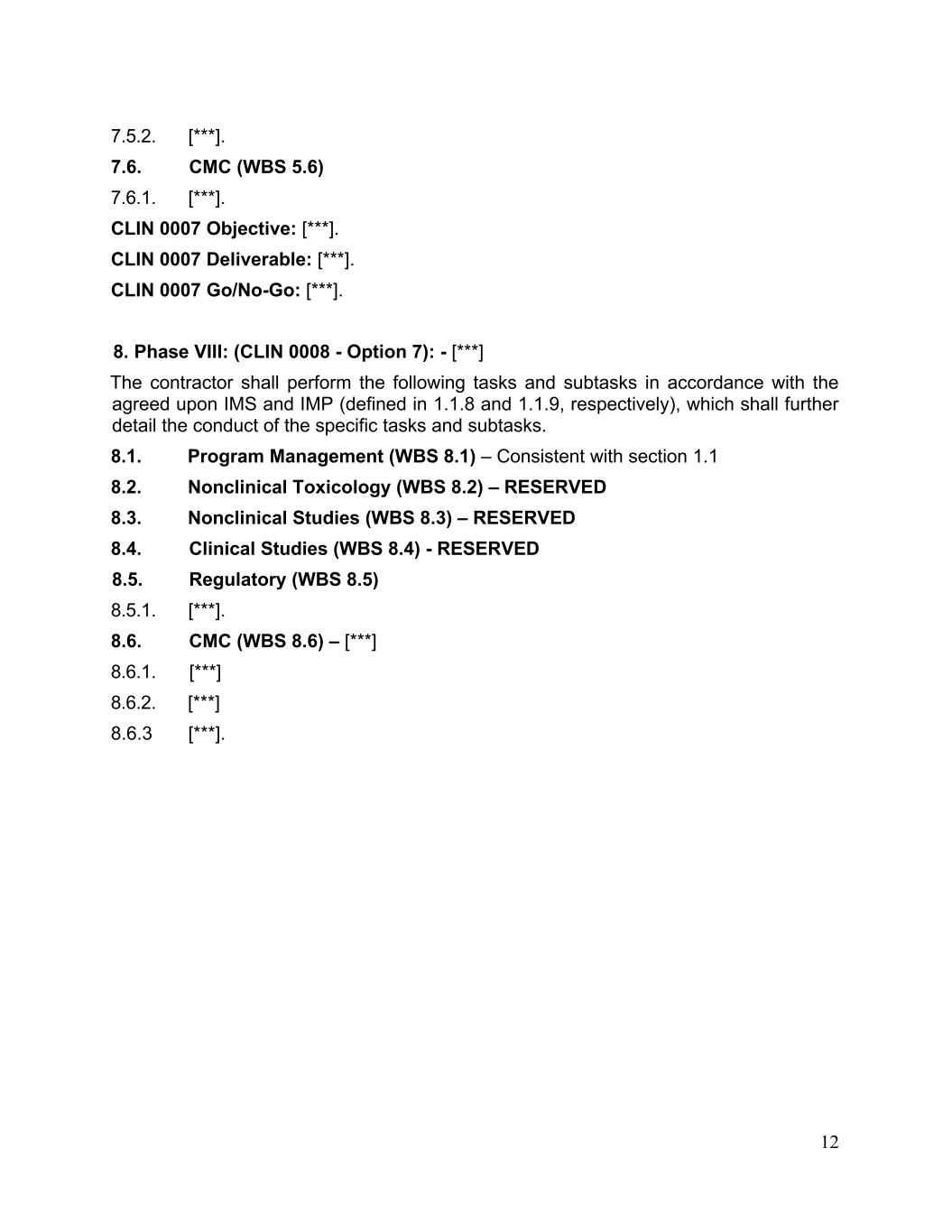 12 7.5.2. [***]. 7.6. CMC (WBS 5.6) 7.6.1. [***]. CLIN 0007 Objective: [***]. CLIN 0007 Deliverable: [***]. CLIN 0007 Go/No-Go: [***]. 8. Phase VIII: (CLIN 0008 - Option 7): - [***] The contractor shall perform the following tasks and subtasks in accordance with the agreed upon IMS and IMP (defined in 1.1.8 and 1.1.9, respectively), which shall further detail the conduct of the specific tasks and subtasks. 8.1. Program Management (WBS 8.1) – Consistent with section 1.1 8.2. Nonclinical Toxicology (WBS 8.2) – RESERVED 8.3. Nonclinical Studies (WBS 8.3) – RESERVED 8.4. Clinical Studies (WBS 8.4) - RESERVED 8.5. Regulatory (WBS 8.5) 8.5.1. [***]. 8.6. CMC (WBS 8.6) – [***] 8.6.1. [***] 8.6.2. [***] 8.6.3 [***].