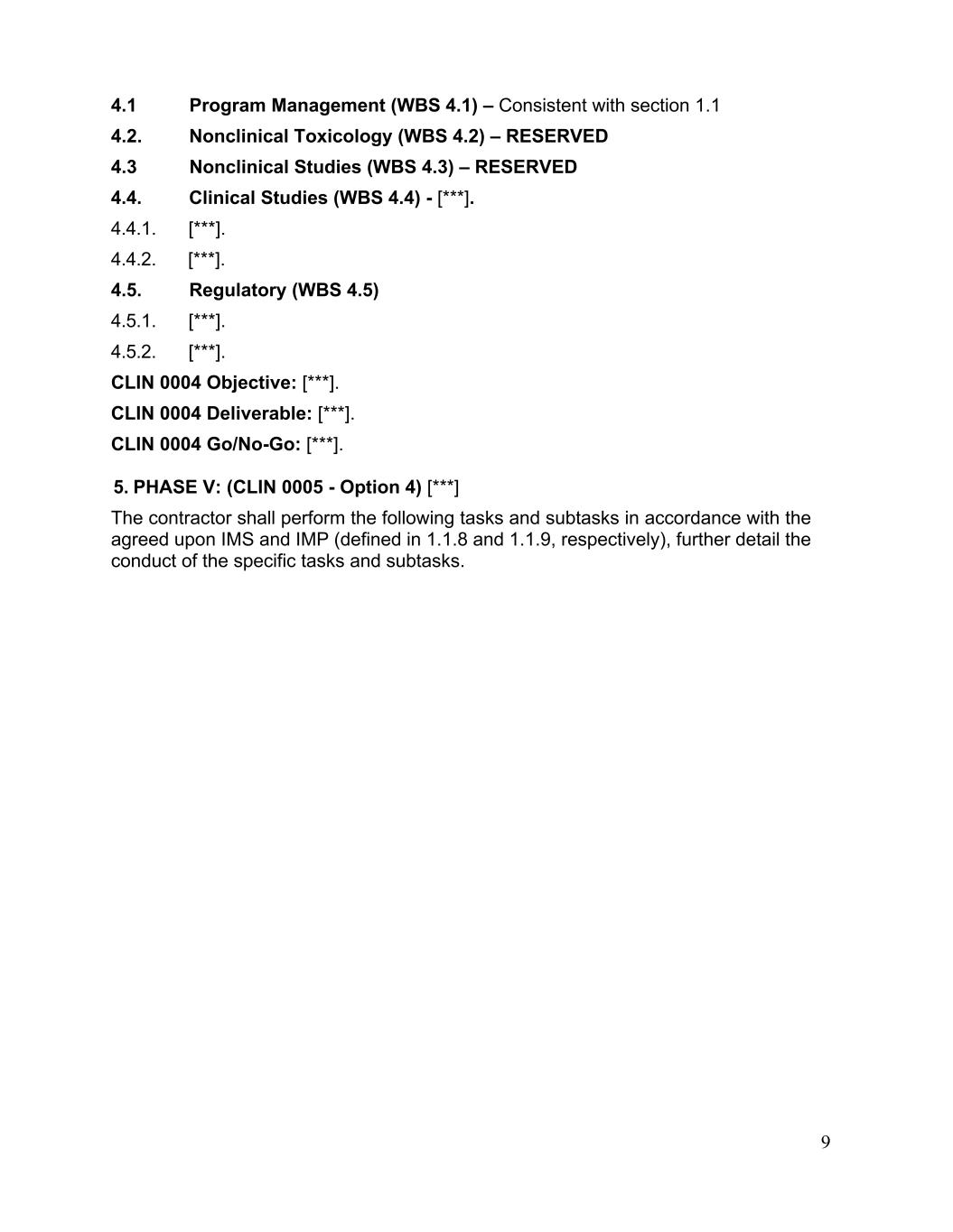 9 4.1 Program Management (WBS 4.1) – Consistent with section 1.1 4.2. Nonclinical Toxicology (WBS 4.2) – RESERVED 4.3 Nonclinical Studies (WBS 4.3) – RESERVED 4.4. Clinical Studies (WBS 4.4) - [***]. 4.4.1. [***]. 4.4.2. [***]. 4.5. Regulatory (WBS 4.5) 4.5.1. [***]. 4.5.2. [***]. CLIN 0004 Objective: [***]. CLIN 0004 Deliverable: [***]. CLIN 0004 Go/No-Go: [***]. 5. PHASE V: (CLIN 0005 - Option 4) [***] The contractor shall perform the following tasks and subtasks in accordance with the agreed upon IMS and IMP (defined in 1.1.8 and 1.1.9, respectively), further detail the conduct of the specific tasks and subtasks.