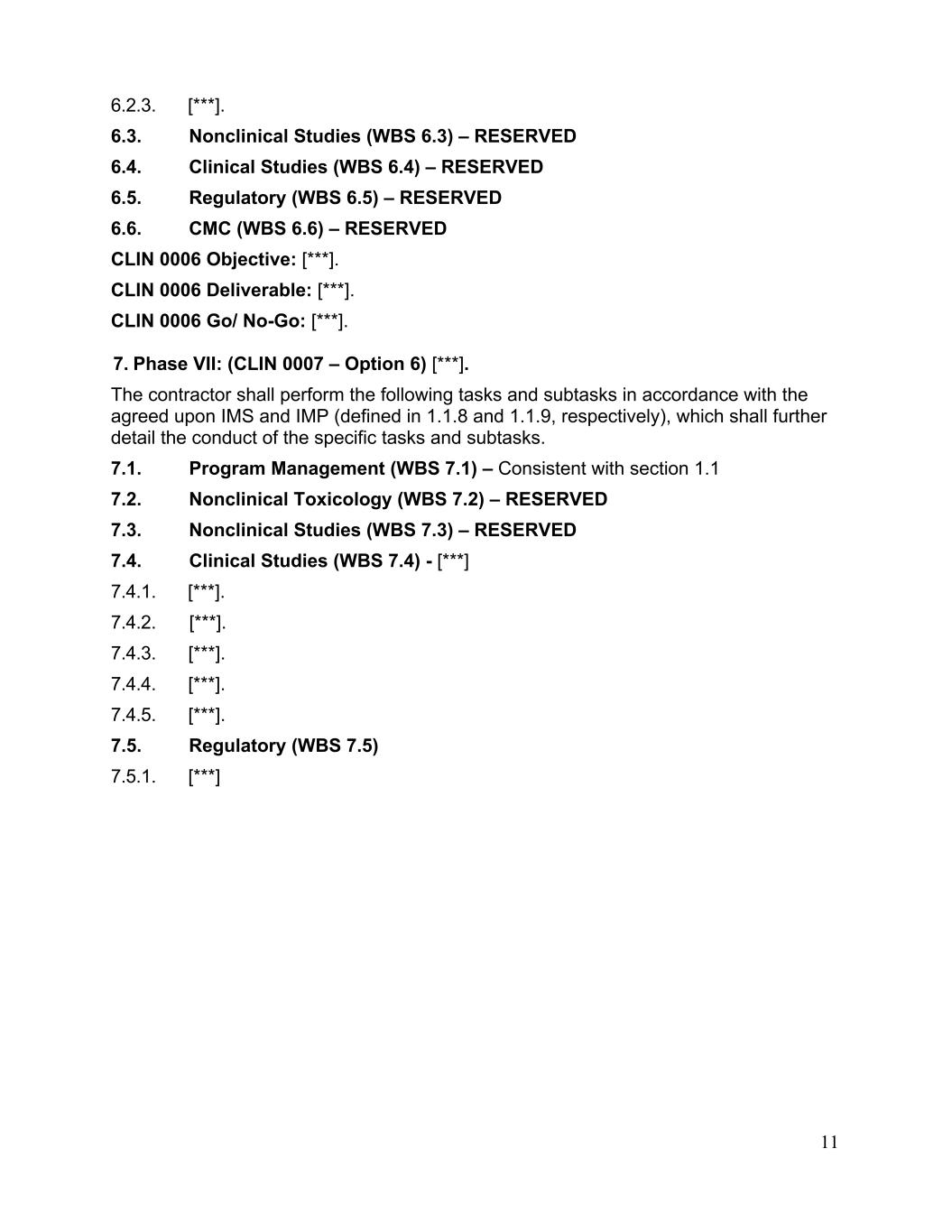11 6.2.3. [***]. 6.3. Nonclinical Studies (WBS 6.3) – RESERVED 6.4. Clinical Studies (WBS 6.4) – RESERVED 6.5. Regulatory (WBS 6.5) – RESERVED 6.6. CMC (WBS 6.6) – RESERVED CLIN 0006 Objective: [***]. CLIN 0006 Deliverable: [***]. CLIN 0006 Go/ No-Go: [***]. 7. Phase VII: (CLIN 0007 – Option 6) [***]. The contractor shall perform the following tasks and subtasks in accordance with the agreed upon IMS and IMP (defined in 1.1.8 and 1.1.9, respectively), which shall further detail the conduct of the specific tasks and subtasks. 7.1. Program Management (WBS 7.1) – Consistent with section 1.1 7.2. Nonclinical Toxicology (WBS 7.2) – RESERVED 7.3. Nonclinical Studies (WBS 7.3) – RESERVED 7.4. Clinical Studies (WBS 7.4) - [***] 7.4.1. [***]. 7.4.2. [***]. 7.4.3. [***]. 7.4.4. [***]. 7.4.5. [***]. 7.5. Regulatory (WBS 7.5) 7.5.1. [***]