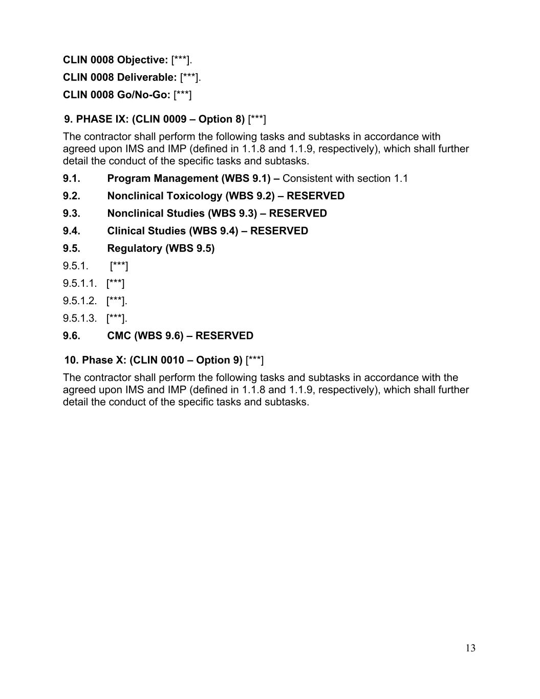 13 CLIN 0008 Objective: [***]. CLIN 0008 Deliverable: [***]. CLIN 0008 Go/No-Go: [***] 9. PHASE IX: (CLIN 0009 – Option 8) [***] The contractor shall perform the following tasks and subtasks in accordance with agreed upon IMS and IMP (defined in 1.1.8 and 1.1.9, respectively), which shall further detail the conduct of the specific tasks and subtasks. 9.1. Program Management (WBS 9.1) – Consistent with section 1.1 9.2. Nonclinical Toxicology (WBS 9.2) – RESERVED 9.3. Nonclinical Studies (WBS 9.3) – RESERVED 9.4. Clinical Studies (WBS 9.4) – RESERVED 9.5. Regulatory (WBS 9.5) 9.5.1. [***] 9.5.1.1. [***] 9.5.1.2. [***]. 9.5.1.3. [***]. 9.6. CMC (WBS 9.6) – RESERVED 10. Phase X: (CLIN 0010 – Option 9) [***] The contractor shall perform the following tasks and subtasks in accordance with the agreed upon IMS and IMP (defined in 1.1.8 and 1.1.9, respectively), which shall further detail the conduct of the specific tasks and subtasks.