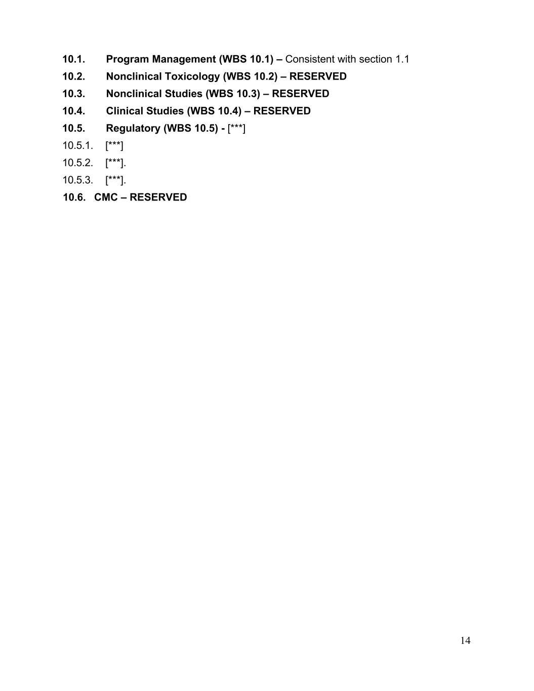 14 10.1. Program Management (WBS 10.1) – Consistent with section 1.1 10.2. Nonclinical Toxicology (WBS 10.2) – RESERVED 10.3. Nonclinical Studies (WBS 10.3) – RESERVED 10.4. Clinical Studies (WBS 10.4) – RESERVED 10.5. Regulatory (WBS 10.5) - [***] 10.5.1. [***] 10.5.2. [***]. 10.5.3. [***]. 10.6. CMC – RESERVED