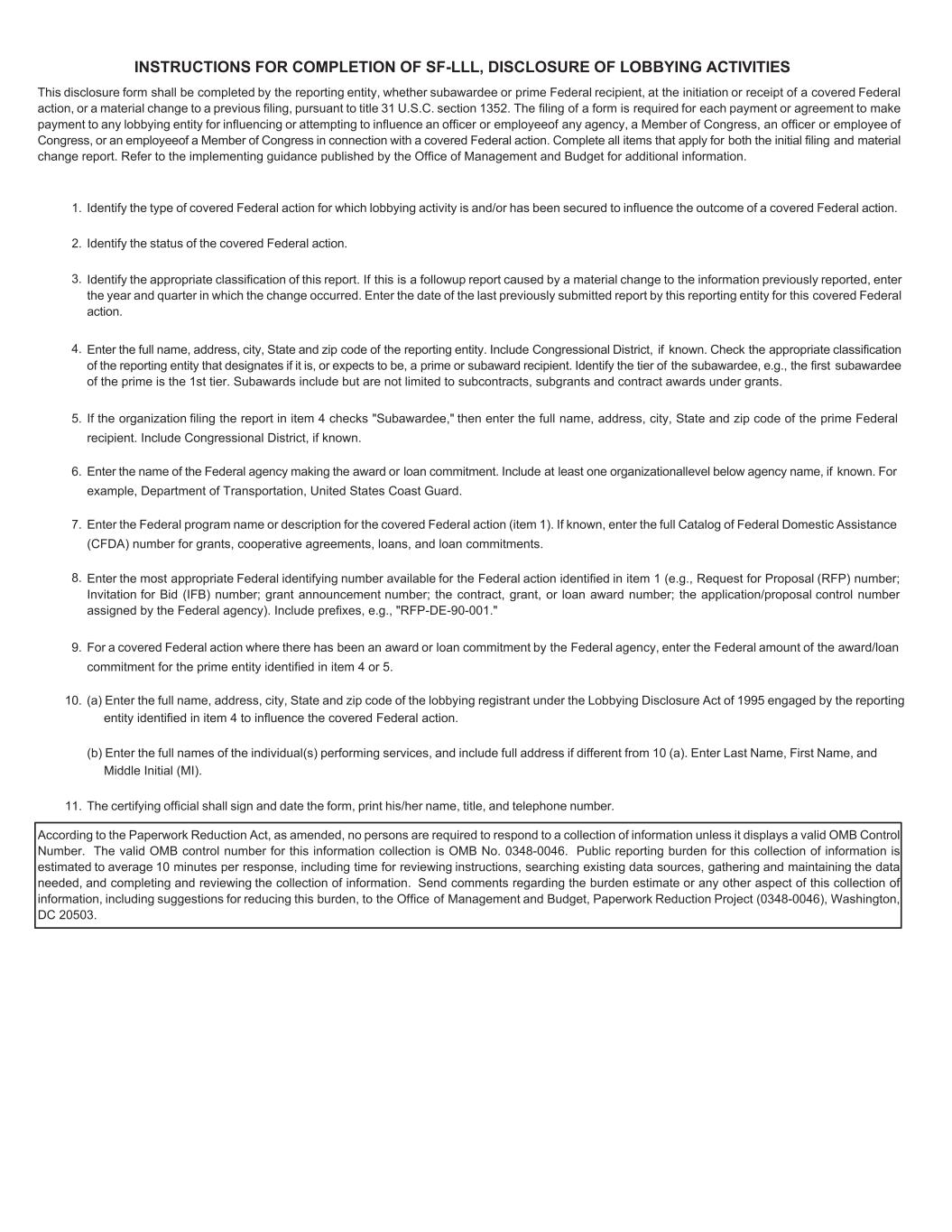 INSTRUCTIONS FOR COMPLETION OF SF-LLL, DISCLOSURE OF LOBBYING ACTIVITIES This disclosure form shall be completed by the reporting entity, whether subawardee or prime Federal recipient, at the initiation or receipt of a covered Federal action, or a material change to a previous filing, pursuant to title 31 U.S.C. section 1352. The filing of a form is required for each payment or agreement to make payment to any lobbying entity for influencing or attempting to influence an officer or employeeof any agency, a Member of Congress, an officer or employee of Congress, or an employeeof a Member of Congress in connection with a covered Federal action. Complete all items that apply for both the initial filing and material change report. Refer to the implementing guidance published by the Office of Management and Budget for additional information. 1. Identify the type of covered Federal action for which lobbying activity is and/or has been secured to influence the outcome of a covered Federal action. 2. Identify the status of the covered Federal action. 3. Identify the appropriate classification of this report. If this is a followup report caused by a material change to the information previously reported, enter the year and quarter in which the change occurred. Enter the date of the last previously submitted report by this reporting entity for this covered Federal action. 4. Enter the full name, address, city, State and zip code of the reporting entity. Include Congressional District, if known. Check the appropriate classification of the reporting entity that designates if it is, or expects to be, a prime or subaward recipient. Identify the tier of the subawardee, e.g., the first subawardee of the prime is the 1st tier. Subawards include but are not limited to subcontracts, subgrants and contract awards under grants. 5. If the organization filing the report in item 4 checks "Subawardee," then enter the full name, address, city, State and zip code of the prime Federal recipient. Include Congressional District, if known. 6. Enter the name of the Federal agency making the award or loan commitment. Include at least one organizationallevel below agency name, if known. For example, Department of Transportation, United States Coast Guard. 7. Enter the Federal program name or description for the covered Federal action (item 1). If known, enter the full Catalog of Federal Domestic Assistance (CFDA) number for grants, cooperative agreements, loans, and loan commitments. 8. Enter the most appropriate Federal identifying number available for the Federal action identified in item 1 (e.g., Request for Proposal (RFP) number; Invitation for Bid (IFB) number; grant announcement number; the contract, grant, or loan award number; the application/proposal control number assigned by the Federal agency). Include prefixes, e.g., "RFP-DE-90-001." 9. For a covered Federal action where there has been an award or loan commitment by the Federal agency, enter the Federal amount of the award/loan commitment for the prime entity identified in item 4 or 5. 10. (a) Enter the full name, address, city, State and zip code of the lobbying registrant under the Lobbying Disclosure Act of 1995 engaged by the reporting entity identified in item 4 to influence the covered Federal action. (b) Enter the full names of the individual(s) performing services, and include full address if different from 10 (a). Enter Last Name, First Name, and Middle Initial (MI). 11. The certifying official shall sign and date the form, print his/her name, title, and telephone number. According to the Paperwork Reduction Act, as amended, no persons are required to respond to a collection of information unless it displays a valid OMB Control Number. The valid OMB control number for this information collection is OMB No. 0348-0046. Public reporting burden for this collection of information is estimated to average 10 minutes per response, including time for reviewing instructions, searching existing data sources, gathering and maintaining the data needed, and completing and reviewing the collection of information. Send comments regarding the burden estimate or any other aspect of this collection of information, including suggestions for reducing this burden, to the Office of Management and Budget, Paperwork Reduction Project (0348-0046), Washington, DC 20503.