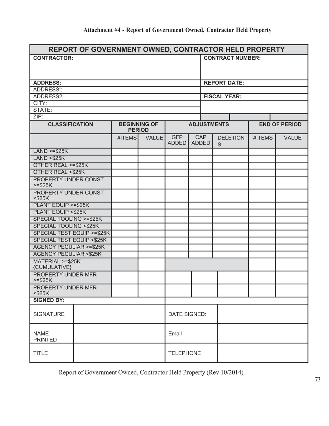 Attachment #4 - Report of Government Owned, Contractor Held Property REPORT OF GOVERNMENT OWNED, CONTRACTOR HELD PROPERTY CONTRACTOR: CONTRACT NUMBER: ADDRESS: REPORT DATE: ADDRESS!: ADDRESS2: FISCAL YEAR: CITY: STATE: ZIP: CLASSIFICATION BEGINNING OF PERIOD ADJUSTMENTS END OF PERIOD #ITEMS VALUE GFP ADDED CAP ADDED DELETION S #ITEMS VALUE LAND >=$25K LAND <$25K OTHER REAL >=$25K OTHER REAL <$25K PROPERTY UNDER CONST >=$25K PROPERTY UNDER CONST <$25K PLANT EQUIP >=$25K PLANT EQUIP <$25K SPECIAL TOOLING >=$25K SPECIAL TOOLING <$25K SPECIAL TEST EQUIP >=$25K SPECIAL TEST EQUIP <$25K AGENCY PECULIAR >=$25K AGENCY PECULIAR <$25K MATERIAL >=$25K {CUMULATIVE} PROPERTY UNDER MFR >=$25K PROPERTY UNDER MFR <$25K SIGNED BY: SIGNATURE DATE SIGNED: NAME PRINTED Email TITLE TELEPHONE Report of Government Owned, Contractor Held Property (Rev 10/2014) 73
