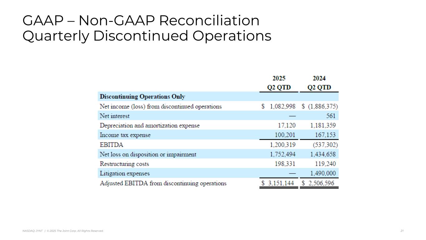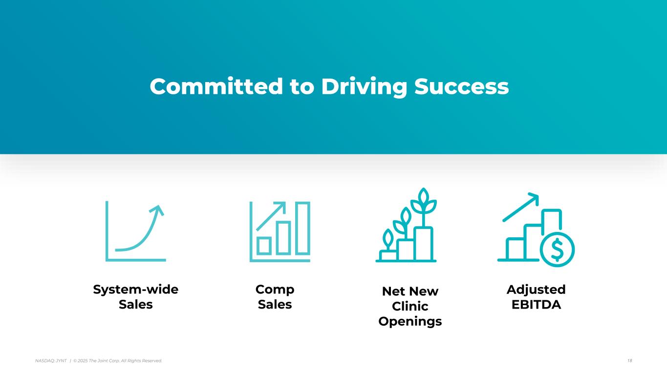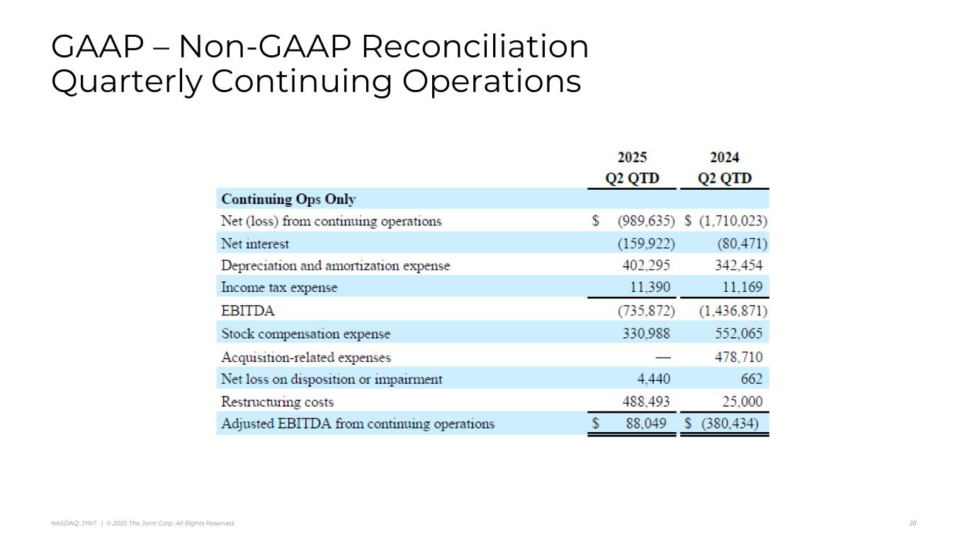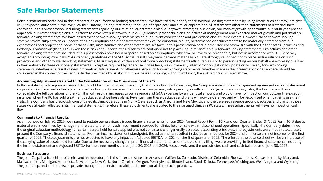 アリゾナ州スコッツデール、2025年8月7日 - カイロプラクティック・クリニックの全国的なオペレーター、マネージャー、フランチャイザーであるジョイント・コーポレーション(NASDAQ:JYNT)は、2025年6月30日に終了した四半期の営業ハイライトと限定的な財務情報を掲載しました。以下の数字は、特に断りのない限り、継続事業を表しています。