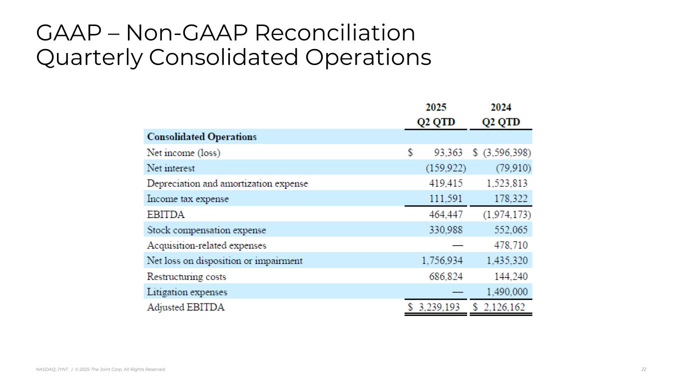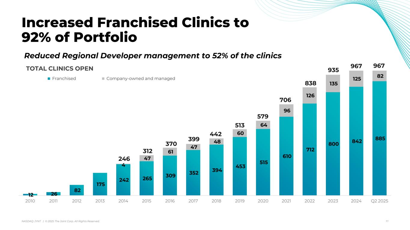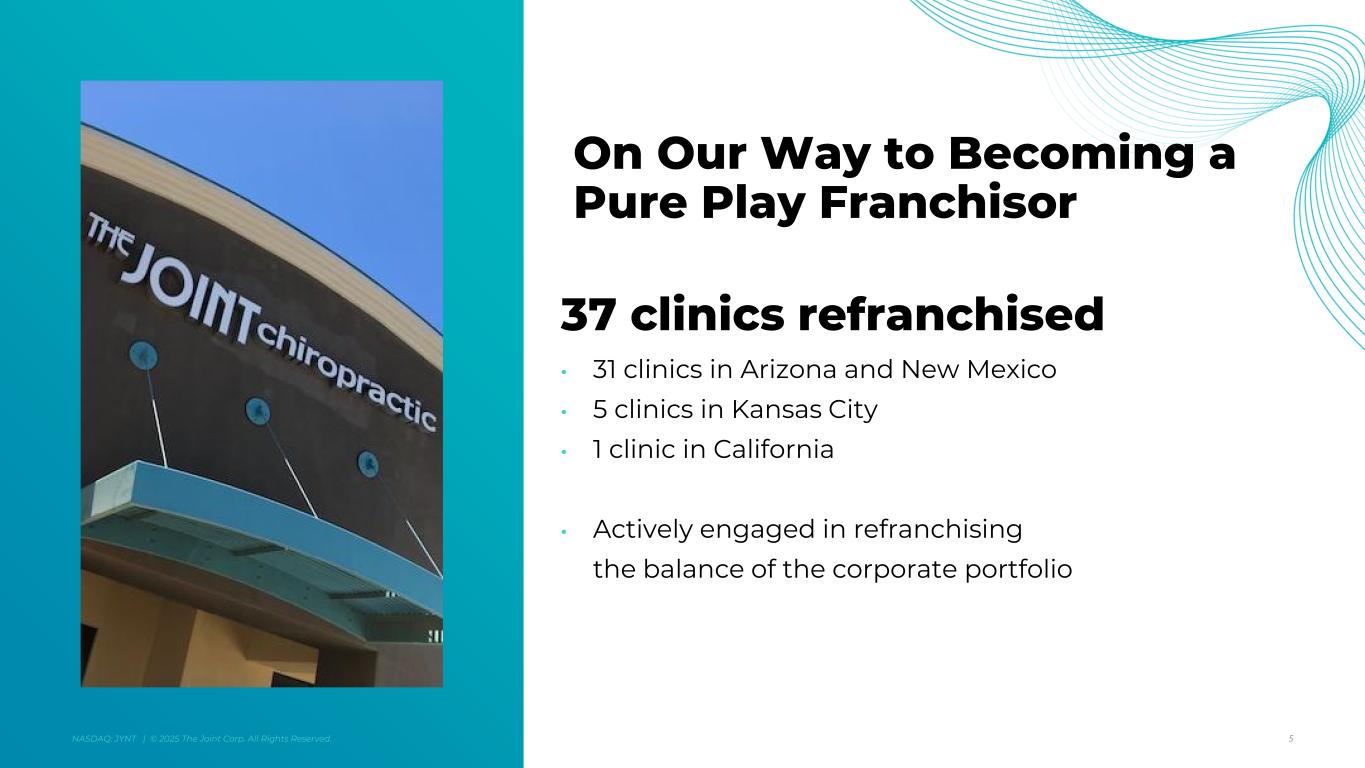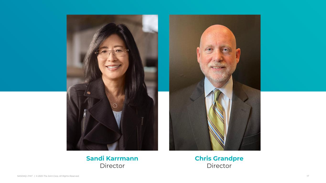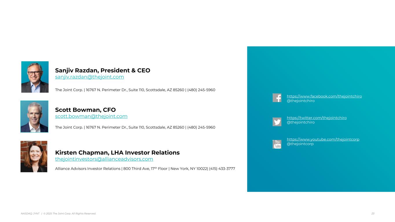 アリゾナ州スコッツデール、2025年8月7日 - カイロプラクティック・クリニックの全国的なオペレーター、マネージャー、フランチャイザーであるジョイント・コーポレーション(NASDAQ:JYNT)は、2025年6月30日に終了した四半期の営業ハイライトと限定的な財務情報を掲載しました。以下の数字は、特に断りのない限り、継続事業を表しています。
