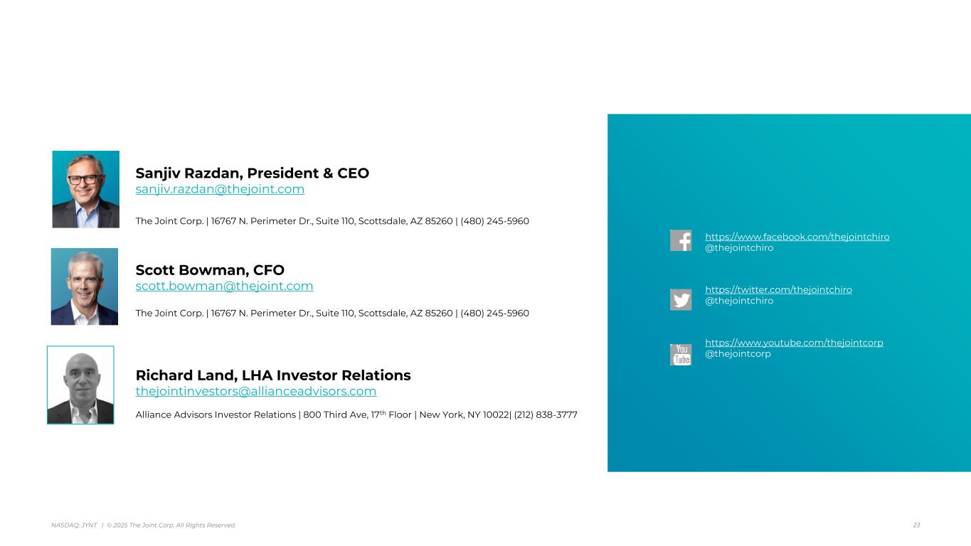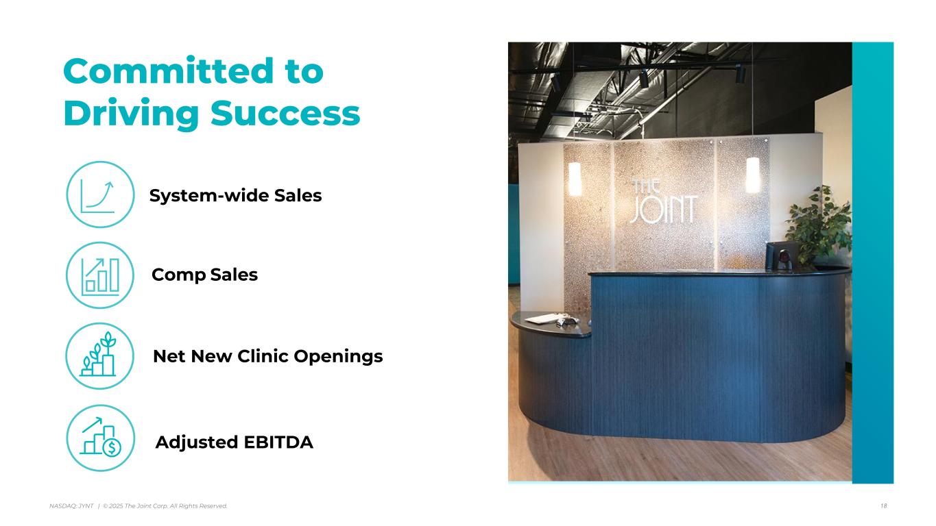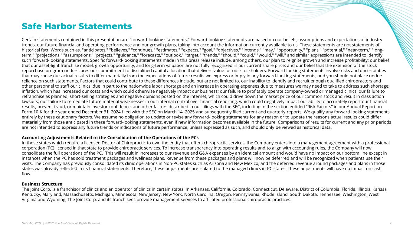 This press release contains statements about future events and expectations that constitute forward-looking statements. Forward-looking statements are based on our beliefs, assumptions and expectations of industry trends, our future financial and operating performance and our growth plans, taking into account the information currently available to us. These statements are not statements of historical fact. Words such as, "anticipates," "believes," "continues," "estimates," "expects," "goal," "objectives," "intends," "may," "opportunity," "plans," "potential," "near-term," "long-term," "projections," "assumptions," "projects," "guidance," "forecasts," "outlook," "target," "trends," "should," "could," "would," "will," and similar expressions are intended to identify such forward-looking statements. Specific forward-looking statements made in this press release include, among others, our belief that the full financial benefit of certain initiatives, including strengthening our management team and executing on strategies to refranchise our corporate portfolio, drive new patient acquisition, grow system-wide sales, and improve comp sales as well as operating leverage, will take time to come to fruition; our plan to finalize corporate clinic purchase agreements; our belief that we remain on track to be a pure-play franchisor by year end; our belief that we will be able to amplify the transition of our brand message toward pain management even further by shifting a portion of our advertising spend to national media; our plan to augment our digital efforts with improved search engine optimization and AI-search, including more impactful microsite content to drive website rankings; our belief that to increase value, we are investing in high-return initiatives and returning capital to our stockholders; our belief that the recent addition of an extra $12 million to our stock repurchase program demonstrates our strong conviction in the progress we’re making toward our goals of reigniting growth and increasing profitability; and our reiterated 2025 guidance for system-wide sales, comp sales, consolidated Adjusted EBITDA, and new clinic openings. Forward-looking statements involve risks and uncertainties that may cause our actual results to differ materially from the expectations of future results we express or imply in any forward-looking statements, and you should not place undue reliance on such statements. Factors that could contribute to these differences include, but are not limited to, our inability to identify and recruit enough qualified chiropractors and other personnel to staff our clinics, due in part to the nationwide labor shortage and an increase in operating expenses due to measures we may need to take to address such shortage; inflation, leading to increased labor costs and interest rates, as well as changes to import tariffs, may lead to reduced discretionary spending, all of which may negatively impact our business; our failure to profitably operate company-owned or managed clinics; our failure to refranchise as planned; short-selling strategies and negative opinions posted on the internet, which could drive down the market price of our common stock and result in class action lawsuits; our failure to remediate future material weaknesses in our internal control over financial reporting, which could negatively impact our ability to accurately report our financial results, prevent fraud, or maintain investor confidence; and other factors described in our filings with the SEC, including in the section entitled “Risk Factors” in our Annual Report on Form 10-K for the year ended December 31, 2024 filed with the SEC on March 14, 2025 and subsequent filings with the SEC. We qualify any forward-looking statements entirely by these cautionary factors. We assume no obligation to update or revise any forward-looking statements for any reason or to update the reasons actual results could differ materially from those anticipated in these forward-looking statements, even if new information becomes available in the future. Comparisons of results for current and any prior periods are not intended to express any future trends or indications of future performance, unless expressed as such, and should only be viewed as historical data.