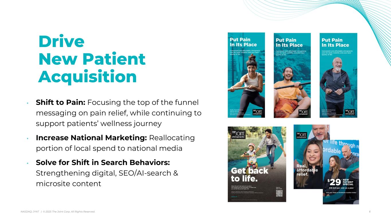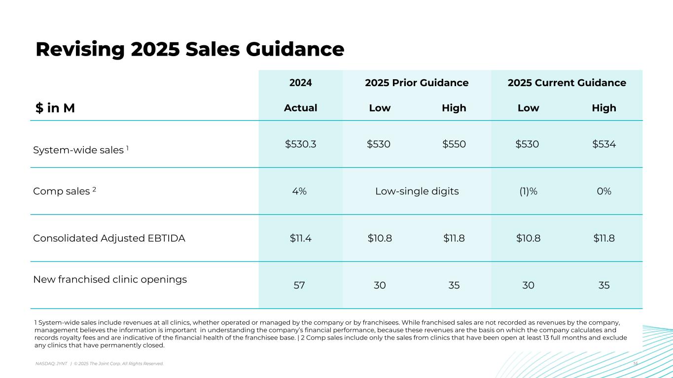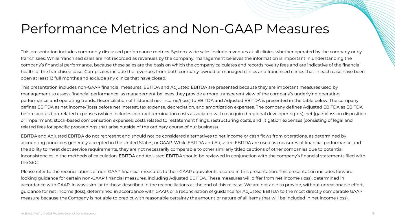 This press release contains statements about future events and expectations that constitute forward-looking statements. Forward-looking statements are based on our beliefs, assumptions and expectations of industry trends, our future financial and operating performance and our growth plans, taking into account the information currently available to us. These statements are not statements of historical fact. Words such as, "anticipates," "believes," "continues," "estimates," "expects," "goal," "objectives," "intends," "may," "opportunity," "plans," "potential," "near-term," "long-term," "projections," "assumptions," "projects," "guidance," "forecasts," "outlook," "target," "trends," "should," "could," "would," "will," and similar expressions are intended to identify such forward-looking statements. Specific forward-looking statements made in this press release include, among others, our belief that the full financial benefit of certain initiatives, including strengthening our management team and executing on strategies to refranchise our corporate portfolio, drive new patient acquisition, grow system-wide sales, and improve comp sales as well as operating leverage, will take time to come to fruition; our plan to finalize corporate clinic purchase agreements; our belief that we remain on track to be a pure-play franchisor by year end; our belief that we will be able to amplify the transition of our brand message toward pain management even further by shifting a portion of our advertising spend to national media; our plan to augment our digital efforts with improved search engine optimization and AI-search, including more impactful microsite content to drive website rankings; our belief that to increase value, we are investing in high-return initiatives and returning capital to our stockholders; our belief that the recent addition of an extra $12 million to our stock repurchase program demonstrates our strong conviction in the progress we’re making toward our goals of reigniting growth and increasing profitability; and our reiterated 2025 guidance for system-wide sales, comp sales, consolidated Adjusted EBITDA, and new clinic openings. Forward-looking statements involve risks and uncertainties that may cause our actual results to differ materially from the expectations of future results we express or imply in any forward-looking statements, and you should not place undue reliance on such statements. Factors that could contribute to these differences include, but are not limited to, our inability to identify and recruit enough qualified chiropractors and other personnel to staff our clinics, due in part to the nationwide labor shortage and an increase in operating expenses due to measures we may need to take to address such shortage; inflation, leading to increased labor costs and interest rates, as well as changes to import tariffs, may lead to reduced discretionary spending, all of which may negatively impact our business; our failure to profitably operate company-owned or managed clinics; our failure to refranchise as planned; short-selling strategies and negative opinions posted on the internet, which could drive down the market price of our common stock and result in class action lawsuits; our failure to remediate future material weaknesses in our internal control over financial reporting, which could negatively impact our ability to accurately report our financial results, prevent fraud, or maintain investor confidence; and other factors described in our filings with the SEC, including in the section entitled “Risk Factors” in our Annual Report on Form 10-K for the year ended December 31, 2024 filed with the SEC on March 14, 2025 and subsequent filings with the SEC. We qualify any forward-looking statements entirely by these cautionary factors. We assume no obligation to update or revise any forward-looking statements for any reason or to update the reasons actual results could differ materially from those anticipated in these forward-looking statements, even if new information becomes available in the future. Comparisons of results for current and any prior periods are not intended to express any future trends or indications of future performance, unless expressed as such, and should only be viewed as historical data.