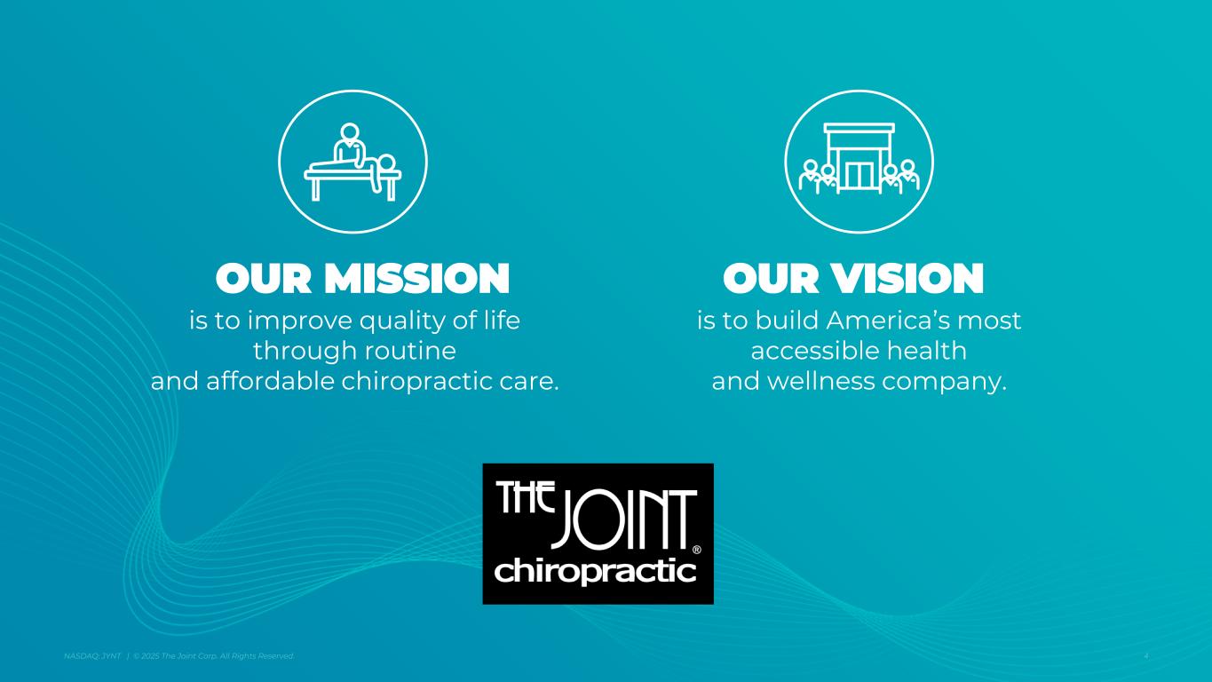 The Joint Corp. (NASDAQ: JYNT) revolutionized access to chiropractic care when it introduced its retail healthcare business model in 2010. Today, it is the nation’s largest operator, manager and franchisor of chiropractic clinics through The Joint Chiropractic network. The company is making quality care convenient and affordable, while eliminating the need for insurance, for millions of patients seeking pain relief and ongoing wellness. Headquartered in Scottsdale and with over 950 locations nationwide and more than 14 million patient visits annually, The Joint Chiropractic is a key leader in the chiropractic industry. The brand is consistently named to Franchise Times’ annual “Top 400” and “Fast & Serious” list of 40 smartest growing brands. Entrepreneur named The Joint “No. 1 in Chiropractic Services,” and it is regularly ranked on the publication’s “Franchise 500,” the “Fastest-Growing Franchises,” and the “Best of the Best” lists, as well as its “Top Franchise for Veterans” and “Top Brands for Multi-Unit Owners” lists. SUCCESS named the company as one of the “Top 50 Franchises” in 2024. The Joint Chiropractic is an innovative force, where healthcare meets retail. For more information, visit www.joint.com. To learn about franchise opportunities, visit www.thejointfranchise.com.