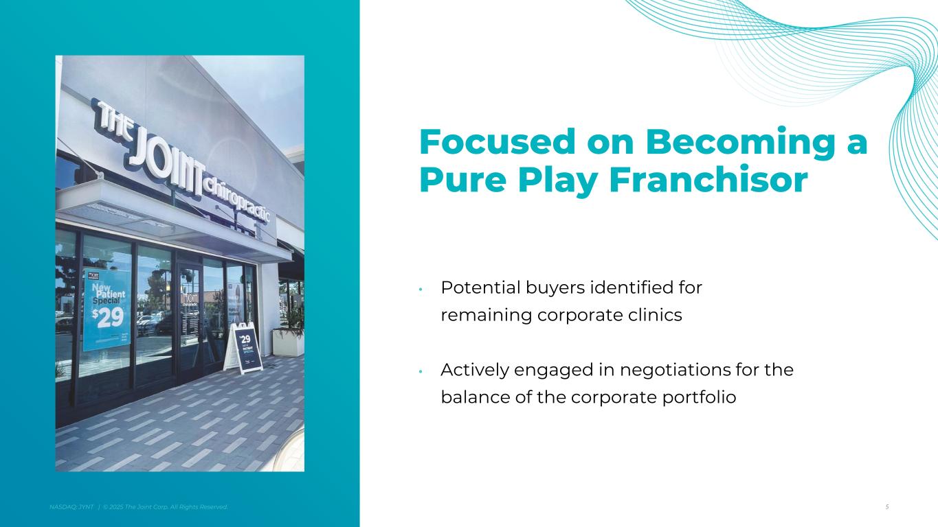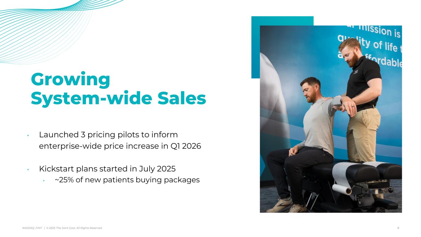 “Throughout 2025, we have strengthened our management team and executed on strategies to refranchise our corporate portfolio, drive new patient acquisition, grow system-wide sales, and improve comp sales as well as operating leverage,” said President and Chief Executive Officer of The Joint Corp., Sanjiv Razdan. “In the third quarter, we made strides on these initiatives, although their full financial benefit will take time to come to fruition. Our brand message has transitioned toward pain management, which will be amplified by shifting a portion of our advertising spend to national media. In addition, we are investing in search engine optimization to leverage AI-search, including more impactful clinic microsite content to drive website rankings. In August, we enhanced our mobile app with new features that are driving an improved patient experience. In November, we initiated a three-tiered pricing pilot for our wellness plan. We are actively negotiating asset purchase agreements for all remaining corporate clinics.