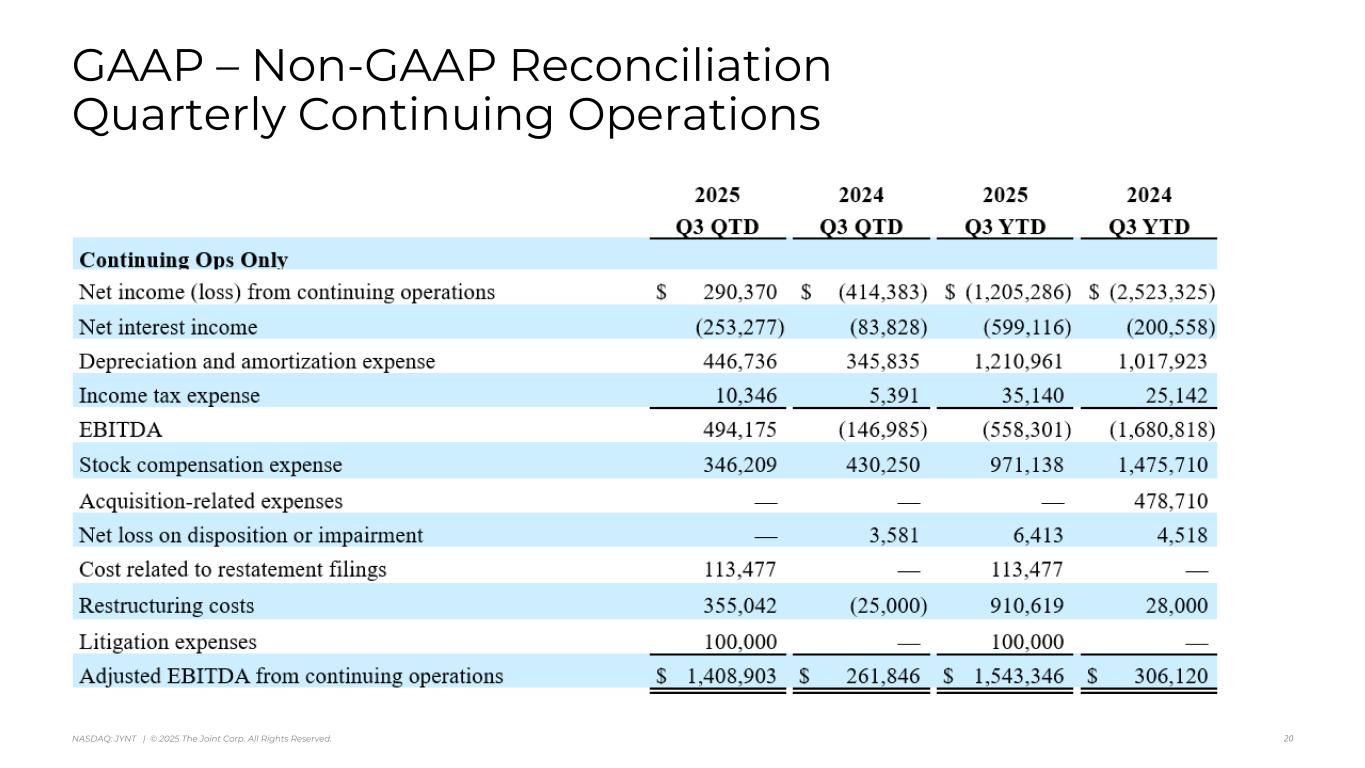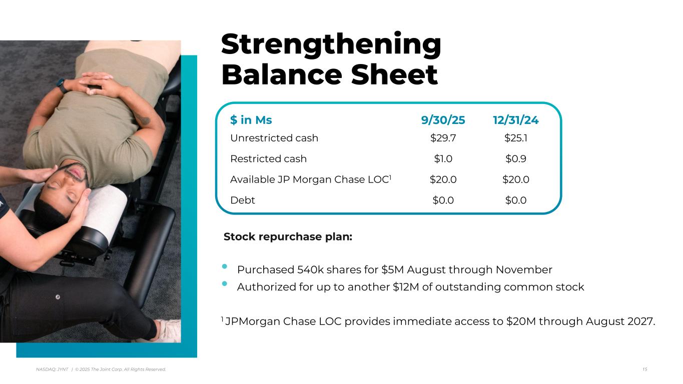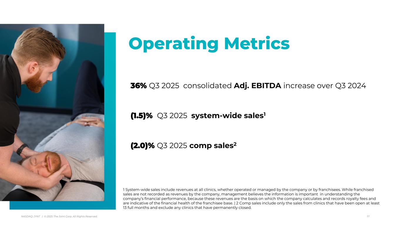 SCOTTSDALE, Ariz., November 6, 2025 – The Joint Corp. (NASDAQ: JYNT), a national operator, manager, and franchisor of chiropractic clinics, posted operating highlights and limited financial information for the quarter ended September 30, 2025. The following figures represent continuing operations unless otherwise stated.