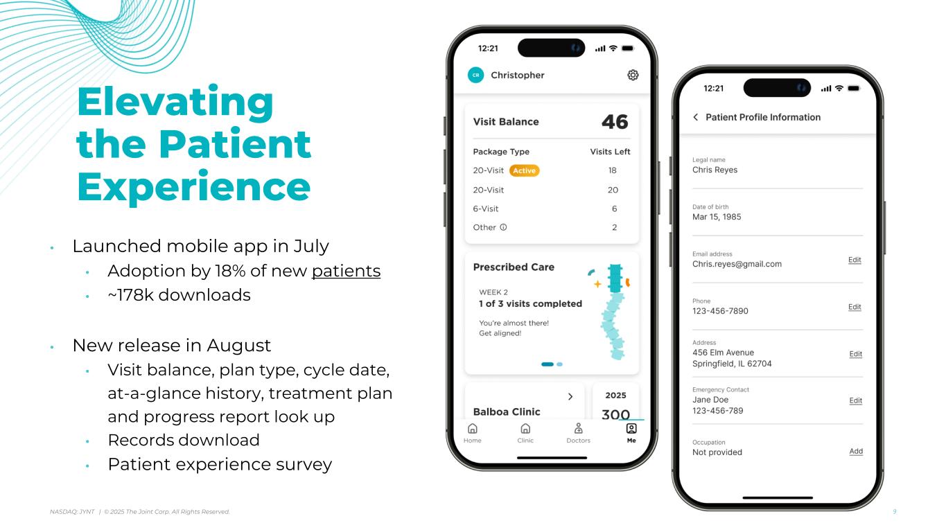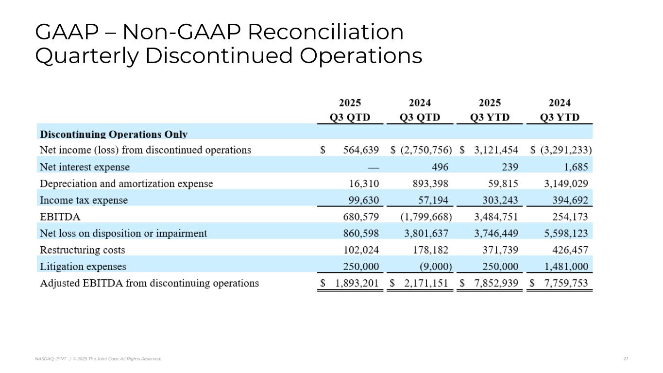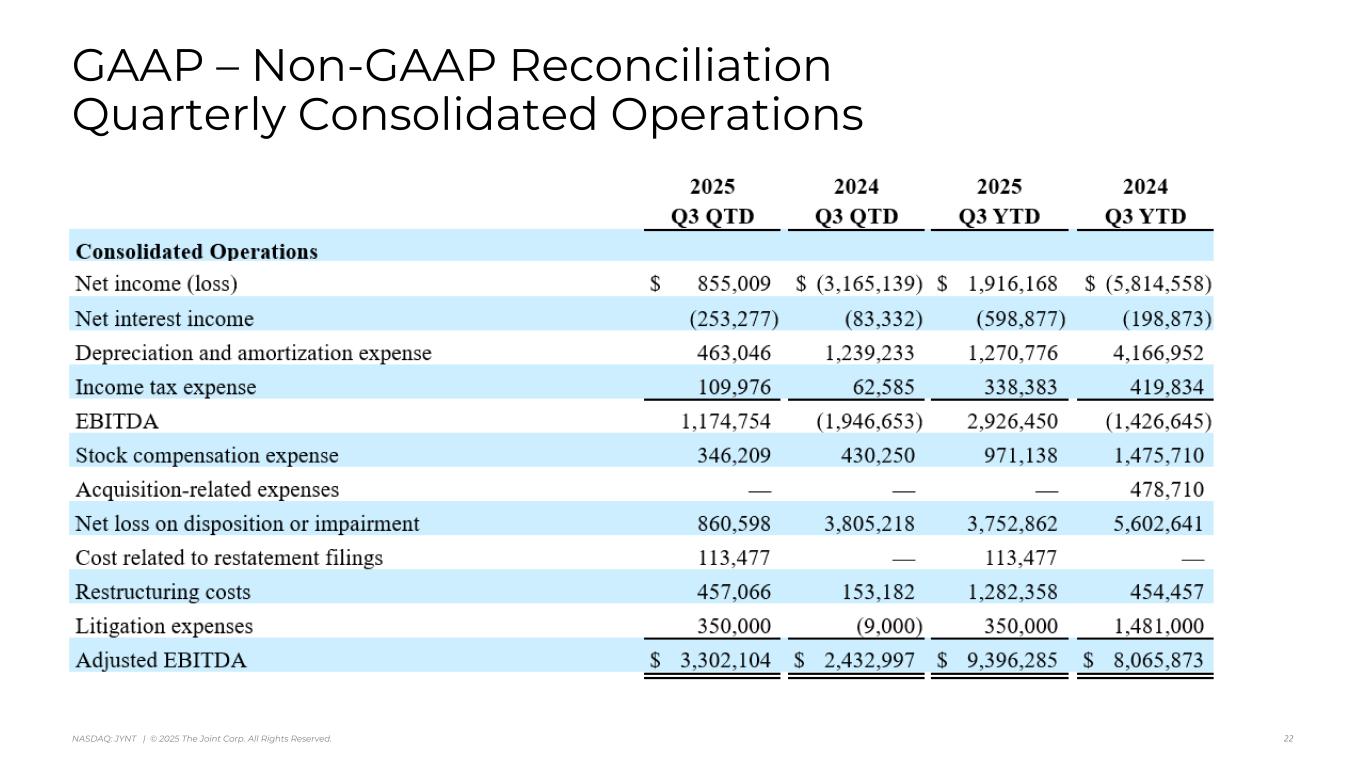 SCOTTSDALE, Ariz., November 6, 2025 – The Joint Corp. (NASDAQ: JYNT), a national operator, manager, and franchisor of chiropractic clinics, posted operating highlights and limited financial information for the quarter ended September 30, 2025. The following figures represent continuing operations unless otherwise stated.
