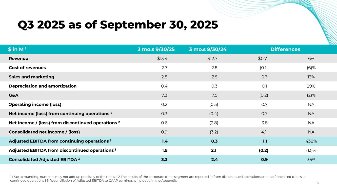 Adjusted EBITDA from consolidated operations increased 36% to $3.3 million, and Adjusted EBITDA from continuing operations improved to $1.4 million, compared to Adjusted EBITDA from consolidated operations of $2.4 million and Adjusted EBITDA from continuing operations of $262,000 in the third quarter of 2024.