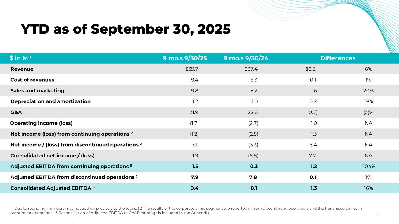 Revenue was $39.7 million in the first nine months of 2025, up 6% compared to $37.4 million in same period in 2024. Consolidated net income was $1.9 million, compared to a net loss of $5.8 million in the nine months ended September 30, 2024. Net loss from continuing operations was $1.2 million, compared to a net loss of $2.5 million in the nine months ended September 30, 2024. Consolidated EPS was $0.12 per diluted share, compared to a net loss of $0.39 per basic share in the nine months ended September 30,2024.
