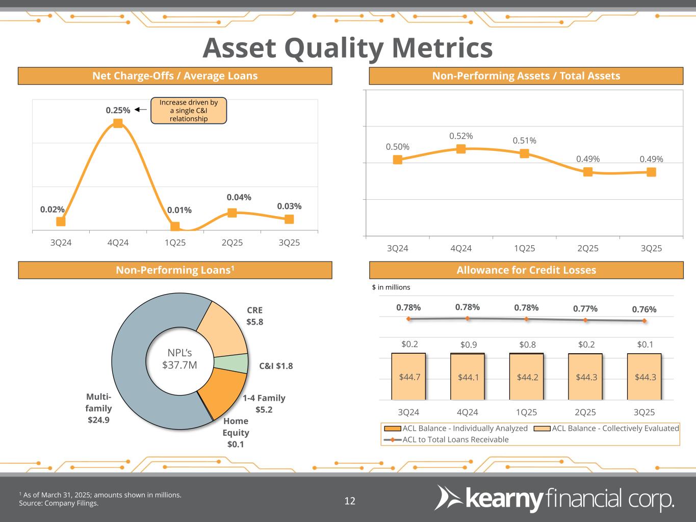 -2025年3月31日に終了した四半期の正味償却額は368,000ドル(年率換算で平均貸付額の0.03%)、これに対し2024年12月31日に終了した四半期は573,000ドル(年率換算で平均貸付額の0.04%)でした。