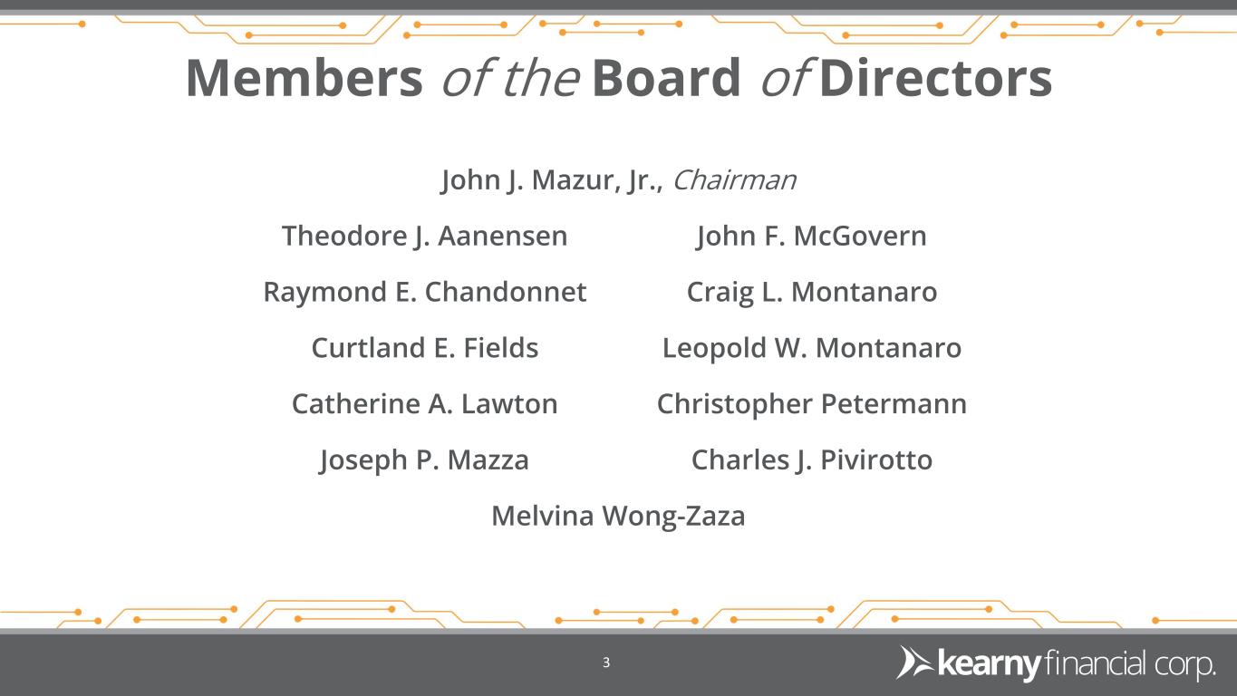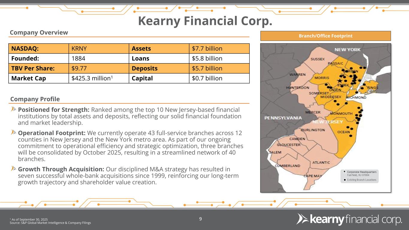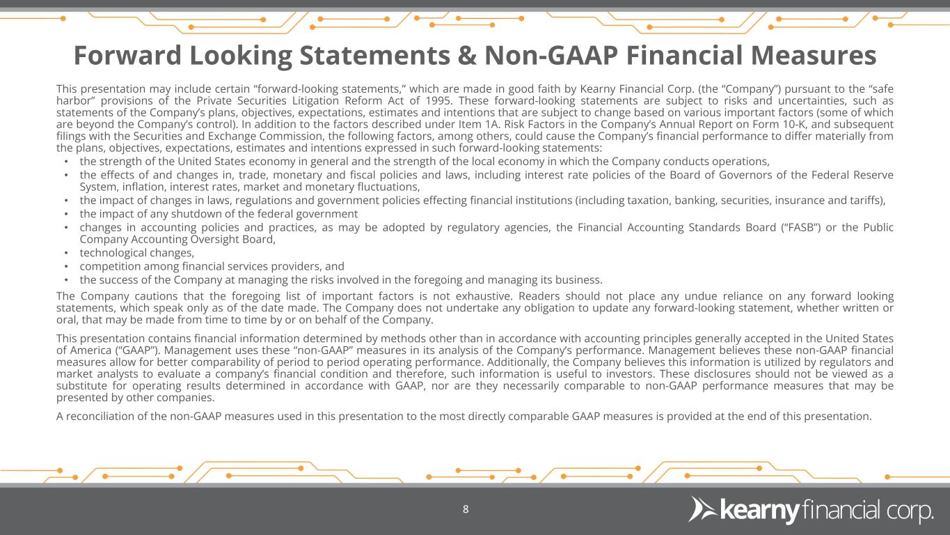 Forward Looking Statements & Non-GAAP Financial Measures 8 This presentation may include certain “forward-looking statements,” which are made in good faith by Kearny Financial Corp. (the “Company”) pursuant to the “safe harbor” provisions of the Private Securities Litigation Reform Act of 1995. These forward-looking statements are subject to risks and uncertainties, such as statements of the Company’s plans, objectives, expectations, estimates and intentions that are subject to change based on various important factors (some of which are beyond the Company’s control). In addition to the factors described under Item 1A. Risk Factors in the Company’s Annual Report on Form 10-K, and subsequent filings with the Securities and Exchange Commission, the following factors, among others, could cause the Company’s financial performance to differ materially from the plans, objectives, expectations, estimates and intentions expressed in such forward-looking statements: • the strength of the United States economy in general and the strength of the local economy in which the Company conducts operations, • the effects of and changes in, trade, monetary and fiscal policies and laws, including interest rate policies of the Board of Governors of the Federal Reserve System, inflation, interest rates, market and monetary fluctuations, • the impact of changes in laws, regulations and government policies effecting financial institutions (including taxation, banking, securities, insurance and tariffs), • the impact of any shutdown of the federal government • changes in accounting policies and practices, as may be adopted by regulatory agencies, the Financial Accounting Standards Board (“FASB”) or the Public Company Accounting Oversight Board, • technological changes, • competition among financial services providers, and • the success of the Company at managing the risks involved in the foregoing and managing its business. The Company cautions that the foregoing list of important factors is not exhaustive. Readers should not place any undue reliance on any forward looking statements, which speak only as of the date made. The Company does not undertake any obligation to update any forward-looking statement, whether written or oral, that may be made from time to time by or on behalf of the Company. This presentation contains financial information determined by methods other than in accordance with accounting principles generally accepted in the United States of America (“GAAP”). Management uses these “non-GAAP” measures in its analysis of the Company’s performance. Management believes these non-GAAP financial measures allow for better comparability of period to period operating performance. Additionally, the Company believes this information is utilized by regulators and market analysts to evaluate a company’s financial condition and therefore, such information is useful to investors. These disclosures should not be viewed as a substitute for operating results determined in accordance with GAAP, nor are they necessarily comparable to non-GAAP performance measures that may be presented by other companies. A reconciliation of the non-GAAP measures used in this presentation to the most directly comparable GAAP measures is provided at the end of this presentation.
