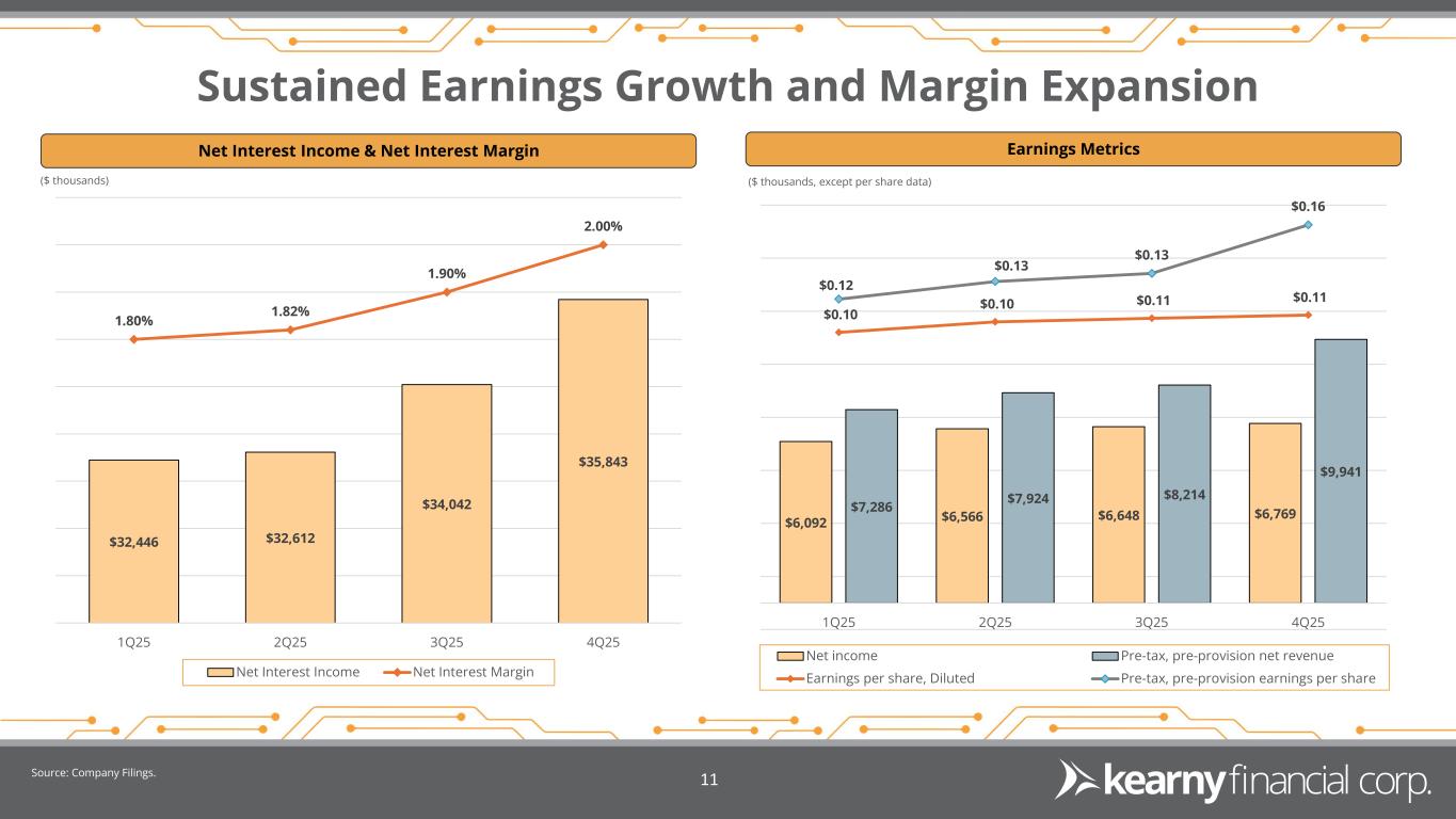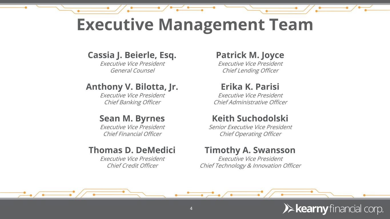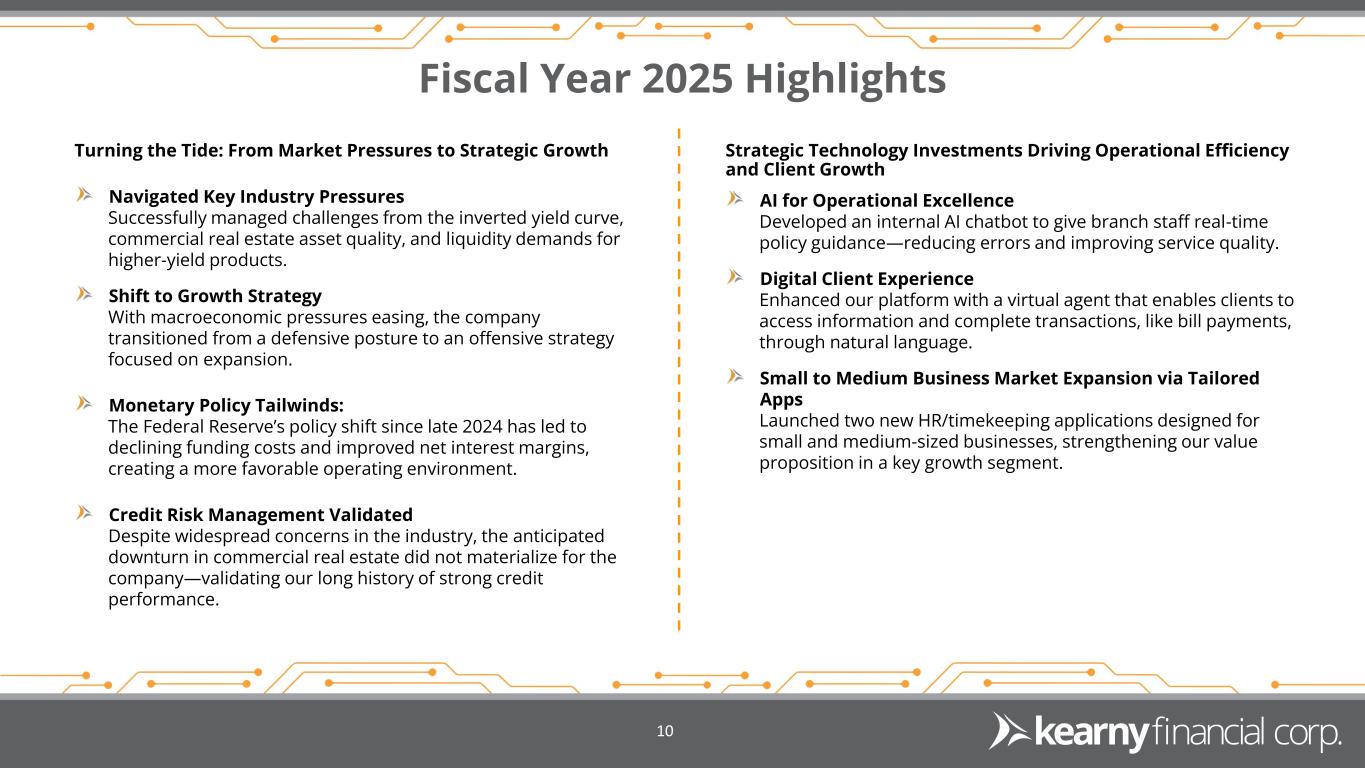 Kearny Financial Corp. Company Overview 1 As of September 30, 2025 Source: S&P Global Market Intelligence & Company Filings 9 Branch/Office Footprint Company Profile Positioned for Strength: Ranked among the top 10 New Jersey-based financial institutions by total assets and deposits, reflecting our solid financial foundation and market leadership. Operational Footprint: We currently operate 43 full-service branches across 12 counties in New Jersey and the New York metro area. As part of our ongoing commitment to operational efficiency and strategic optimization, three branches will be consolidated by October 2025, resulting in a streamlined network of 40 branches. Growth Through Acquisition: Our disciplined M&A strategy has resulted in seven successful whole-bank acquisitions since 1999, reinforcing our long-term growth trajectory and shareholder value creation. NASDAQ: KRNY Assets $7.7 billion Founded: 1884 Loans $5.8 billion TBV Per Share: $9.77 Deposits $5.7 billion Market Cap $425.3 million1 Capital $0.7 billion