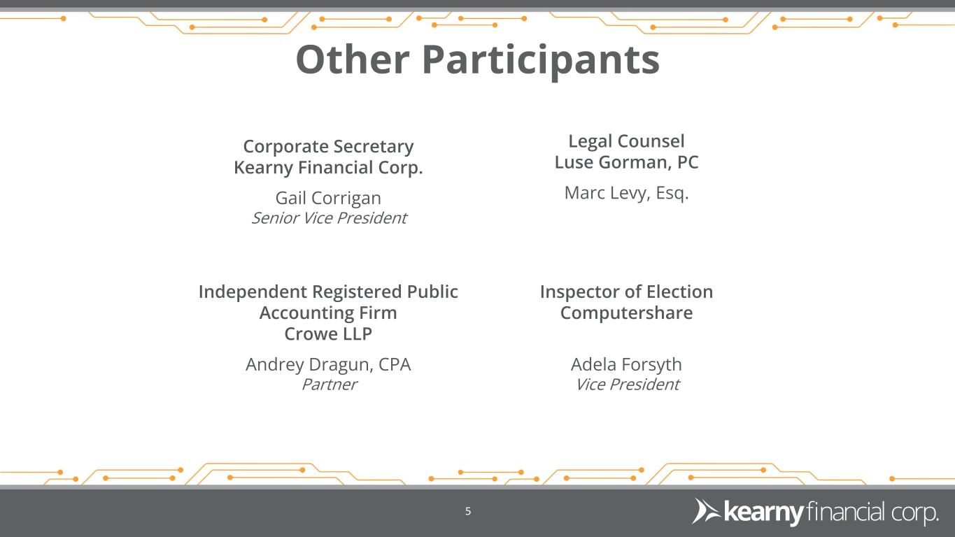 Other Participants Corporate Secretary Kearny Financial Corp. Gail Corrigan Senior Vice President Legal Counsel Luse Gorman, PC Marc Levy, Esq. Independent Registered Public Accounting Firm Crowe LLP Andrey Dragun, CPA Partner Inspector of Election Computershare Adela Forsyth Vice President 5