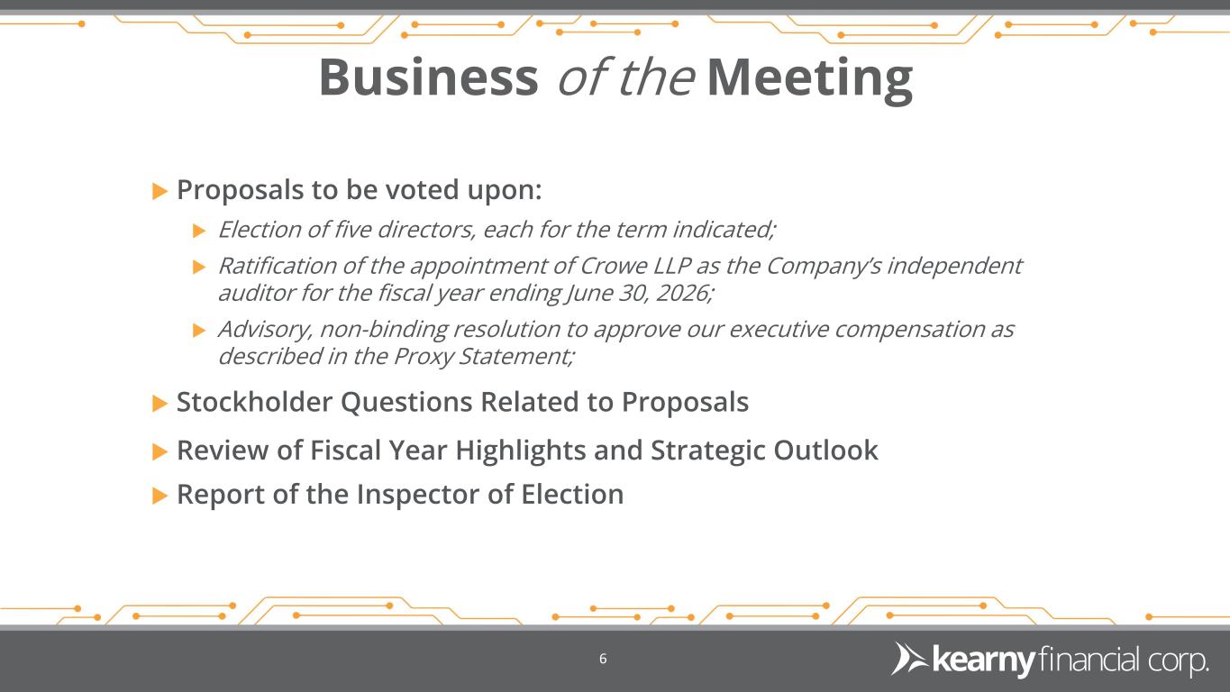 Business of the Meeting Proposals to be voted upon: Election of five directors, each for the term indicated; Ratification of the appointment of Crowe LLP as the Company’s independent auditor for the fiscal year ending June 30, 2026; Advisory, non-binding resolution to approve our executive compensation as described in the Proxy Statement; Stockholder Questions Related to Proposals Review of Fiscal Year Highlights and Strategic Outlook Report of the Inspector of Election 6