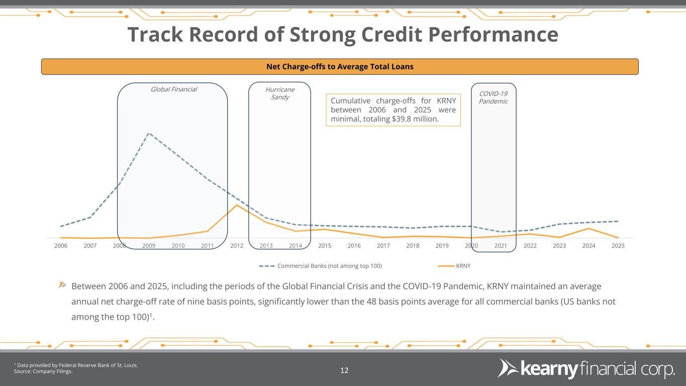 Track Record of Strong Credit Performance 1 Data provided by Federal Reserve Bank of St. Louis. Source: Company Filings. 12 Between 2006 and 2025, including the periods of the Global Financial Crisis and the COVID-19 Pandemic, KRNY maintained an average annual net charge-off rate of nine basis points, significantly lower than the 48 basis points average for all commercial banks (US banks not among the top 100)1. Net Charge-offs to Average Total Loans 2006 2007 2008 2009 2010 2011 2012 2013 2014 2015 2016 2017 2018 2019 2020 2021 2022 2023 2024 2025 Commercial Banks (not among top 100) KRNY Global Financial Hurricane Sandy COVID-19 PandemicCumulative charge-offs for KRNY between 2006 and 2025 were minimal, totaling $39.8 million.