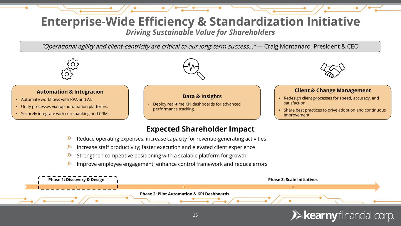 14 Positioned for Earnings Growth in a Declining Rate Environment: The balance sheet is strategically positioned to benefit from rate cuts and yield curve normalization, reflecting a liability-sensitive structure. Low-cost core deposit base is expected to reprice more quickly than assets, which are predominantly fixed-rate, enhancing margin resilience. Favorable Interest Rate Positioning Minimal exposure to New York City office and rent- regulated multifamily properties, representing a small fraction of the total loan portfolio. Historical net charge-offs continue to consistently outperform peer benchmarks, underscoring strong credit discipline and portfolio quality. Proven Asset Quality Ongoing cost discipline initiatives are focused on eliminating inefficiencies and optimizing resource allocation to support long-term profitability and financial strength. Continue to invest in automation and AI technologies—including robotic process automation (RPA)—to drive operational efficiency and streamline workflows. Operating Efficiency Improvements
