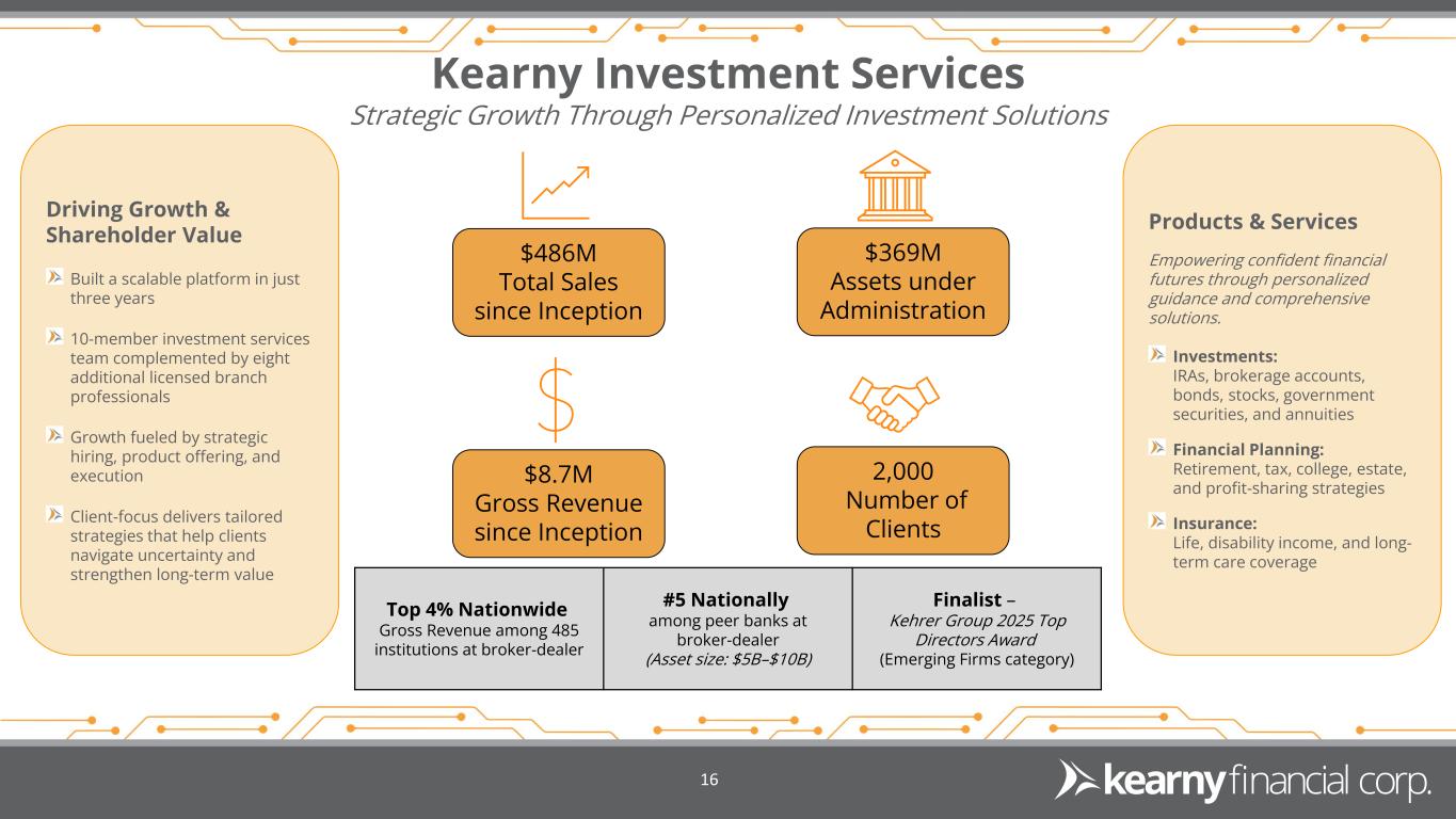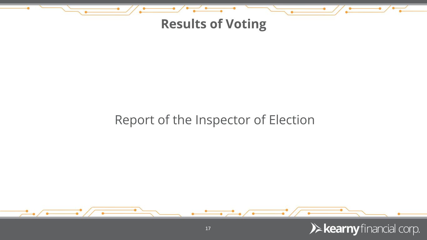 16 Kearny Investment Services Strategic Growth Through Personalized Investment Solutions Top 4% Nationwide Gross Revenue among 485 institutions at broker-dealer #5 Nationally among peer banks at broker-dealer (Asset size: $5B–$10B) Finalist – Kehrer Group 2025 Top Directors Award (Emerging Firms category) $486M Total Sales since Inception $8.7M Gross Revenue since Inception 2,000 Number of Clients $369M Assets under Administration Driving Growth & Shareholder Value Built a scalable platform in just three years 10-member investment services team complemented by eight additional licensed branch professionals Growth fueled by strategic hiring, product offering, and execution Client-focus delivers tailored strategies that help clients navigate uncertainty and strengthen long-term value Products & Services Empowering confident financial futures through personalized guidance and comprehensive solutions. Investments: IRAs, brokerage accounts, bonds, stocks, government securities, and annuities Financial Planning: Retirement, tax, college, estate, and profit-sharing strategies Insurance: Life, disability income, and long- term care coverage