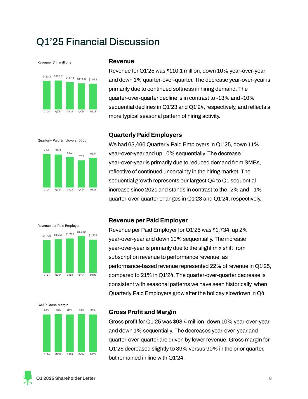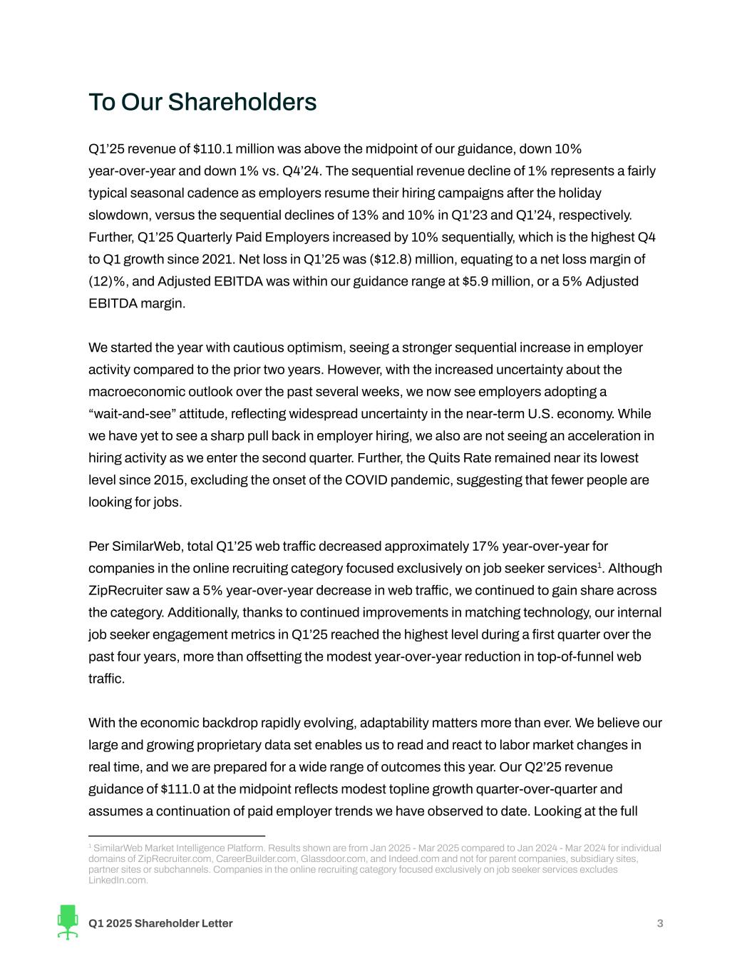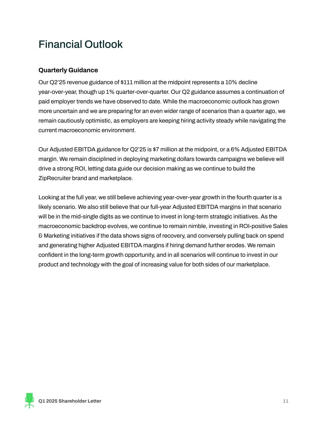 カリフォルニア州サンタモニカ(2025年5月8日) - オンライン雇用市場の大手であるZipRecruiter®(NYSE:ZIP)は本日、2025年3月31日に終了した四半期の財務結果を発表しました。ZipRecruiterの完全な第1四半期の結果、財務ガイダンス、および経営陣のコメントは、投資家向けウェブサイトのinvestors.ziprecruiter.comの四半期決算ページにあるZipRecruiterの株主通信にアクセスすることで見つけることができます。