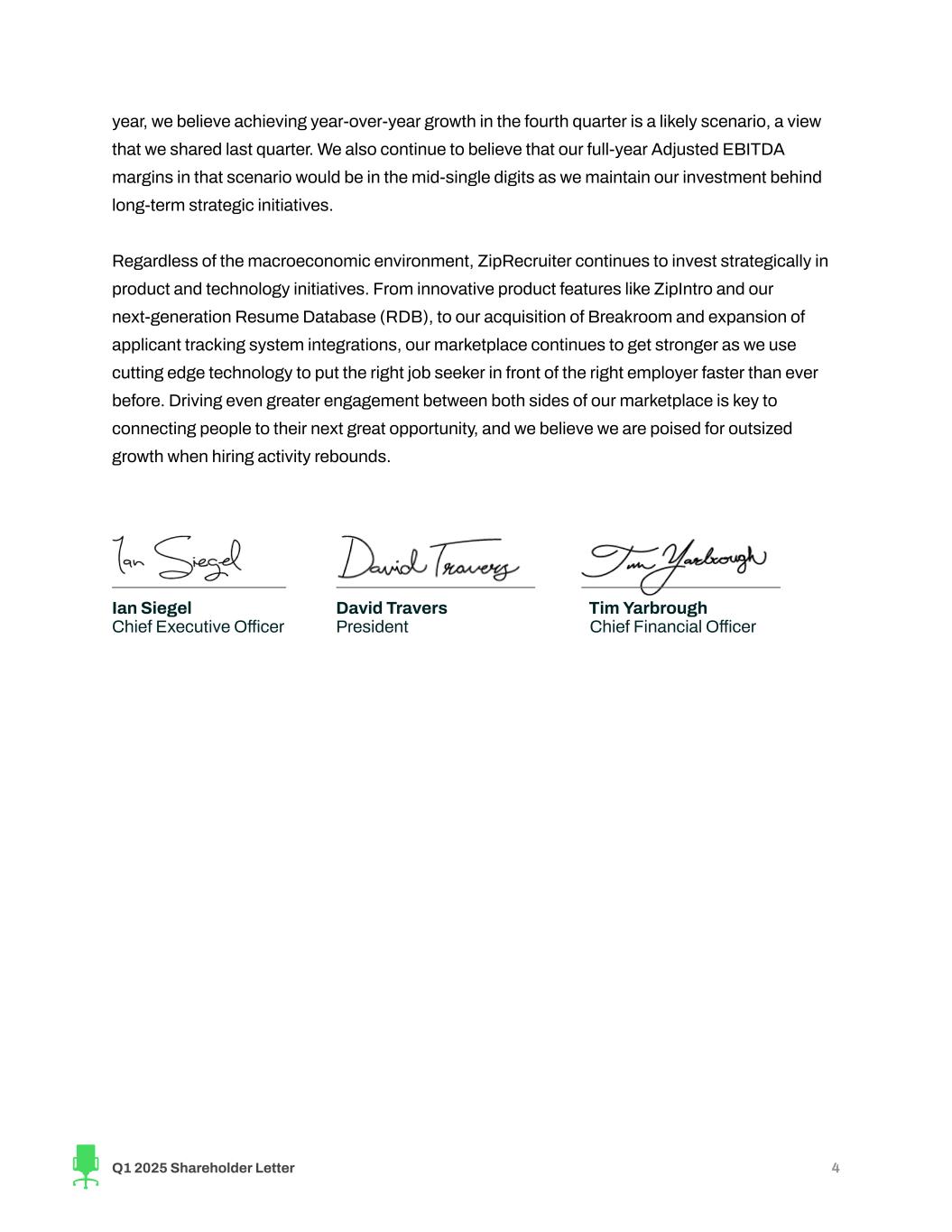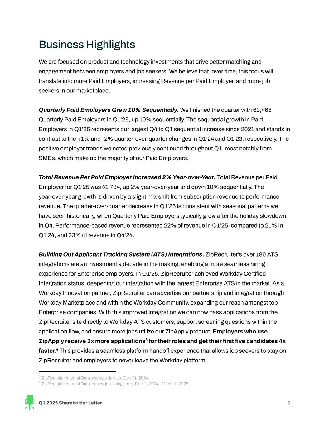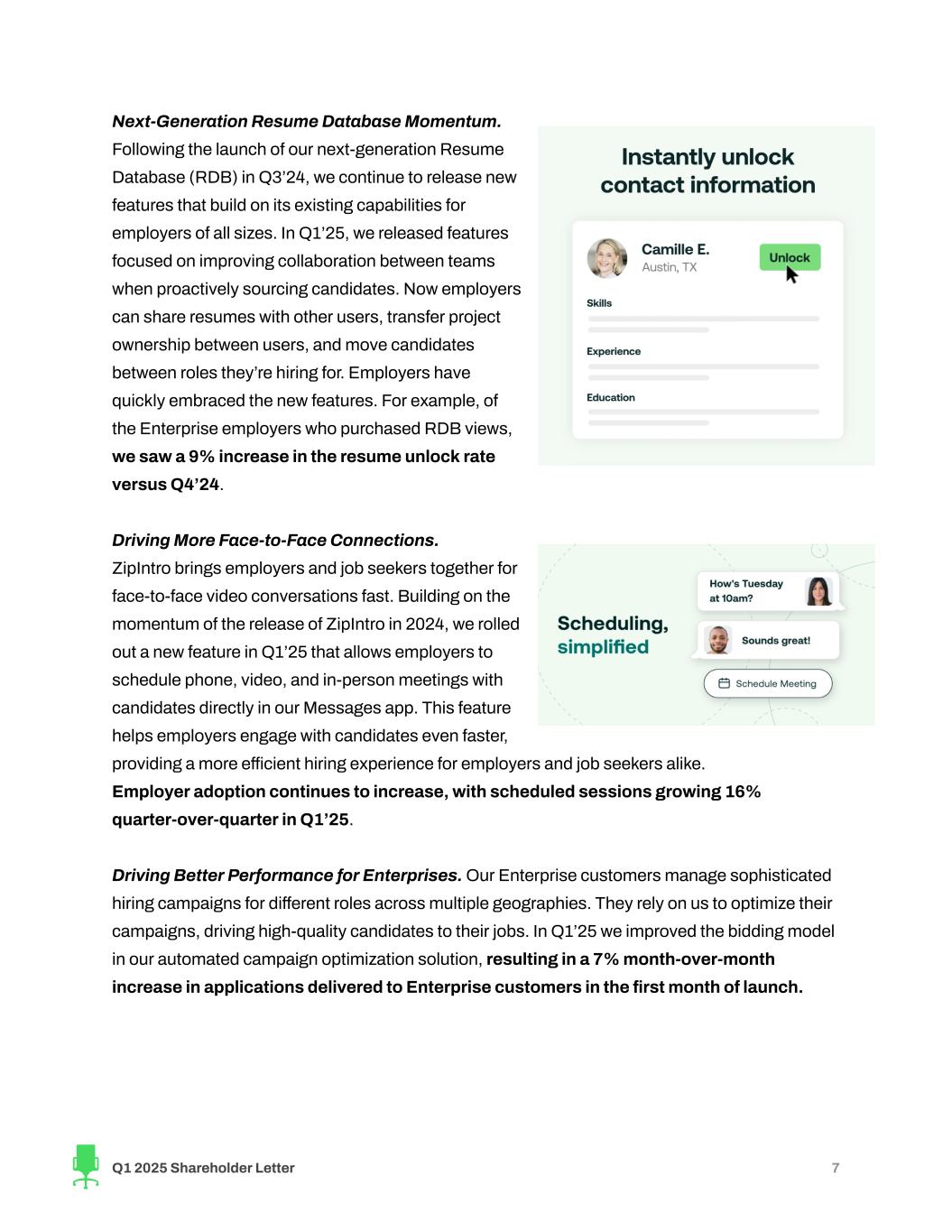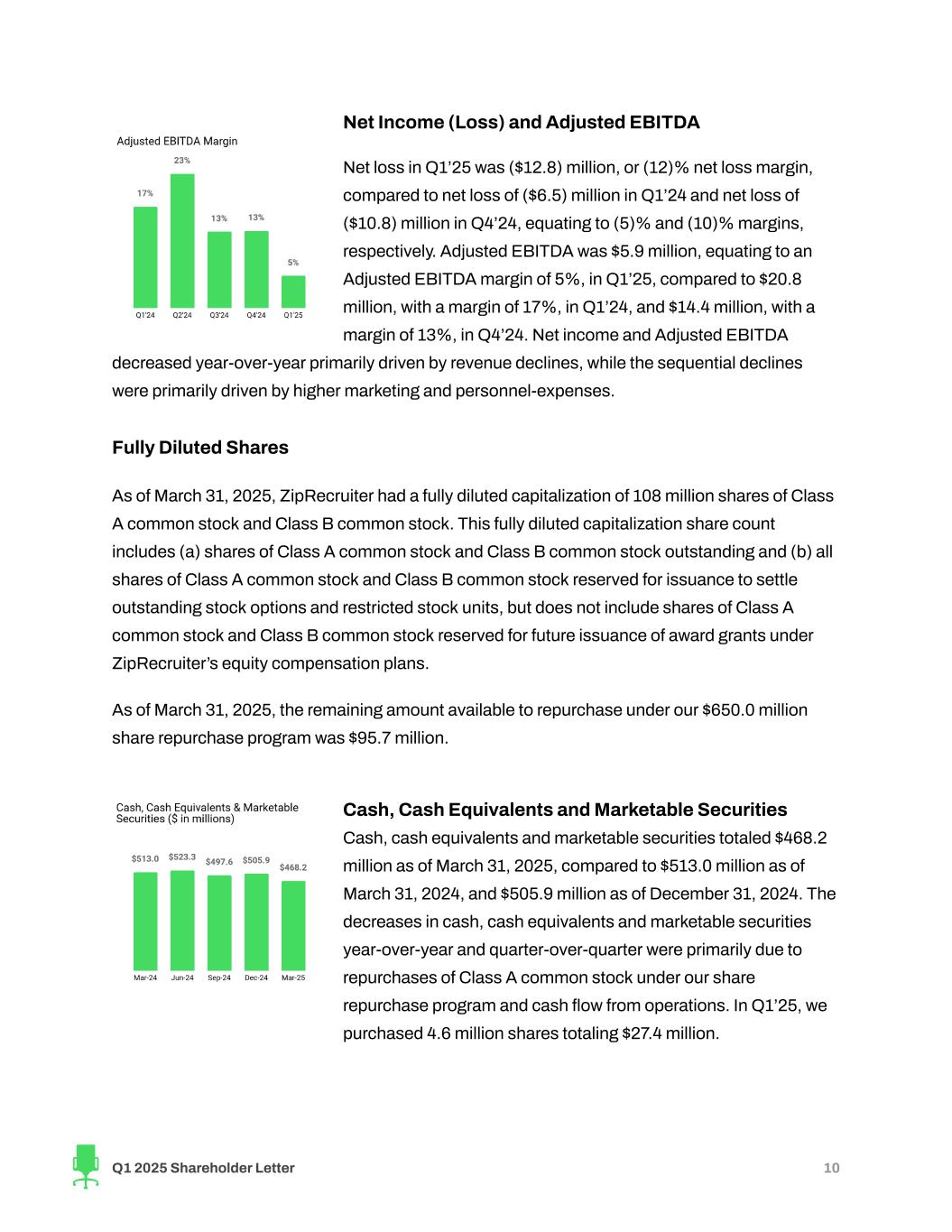カリフォルニア州サンタモニカ(2025年5月8日) - オンライン雇用市場の大手であるZipRecruiter®(NYSE:ZIP)は本日、2025年3月31日に終了した四半期の財務結果を発表しました。ZipRecruiterの完全な第1四半期の結果、財務ガイダンス、および経営陣のコメントは、投資家向けウェブサイトのinvestors.ziprecruiter.comの四半期決算ページにあるZipRecruiterの株主通信にアクセスすることで見つけることができます。