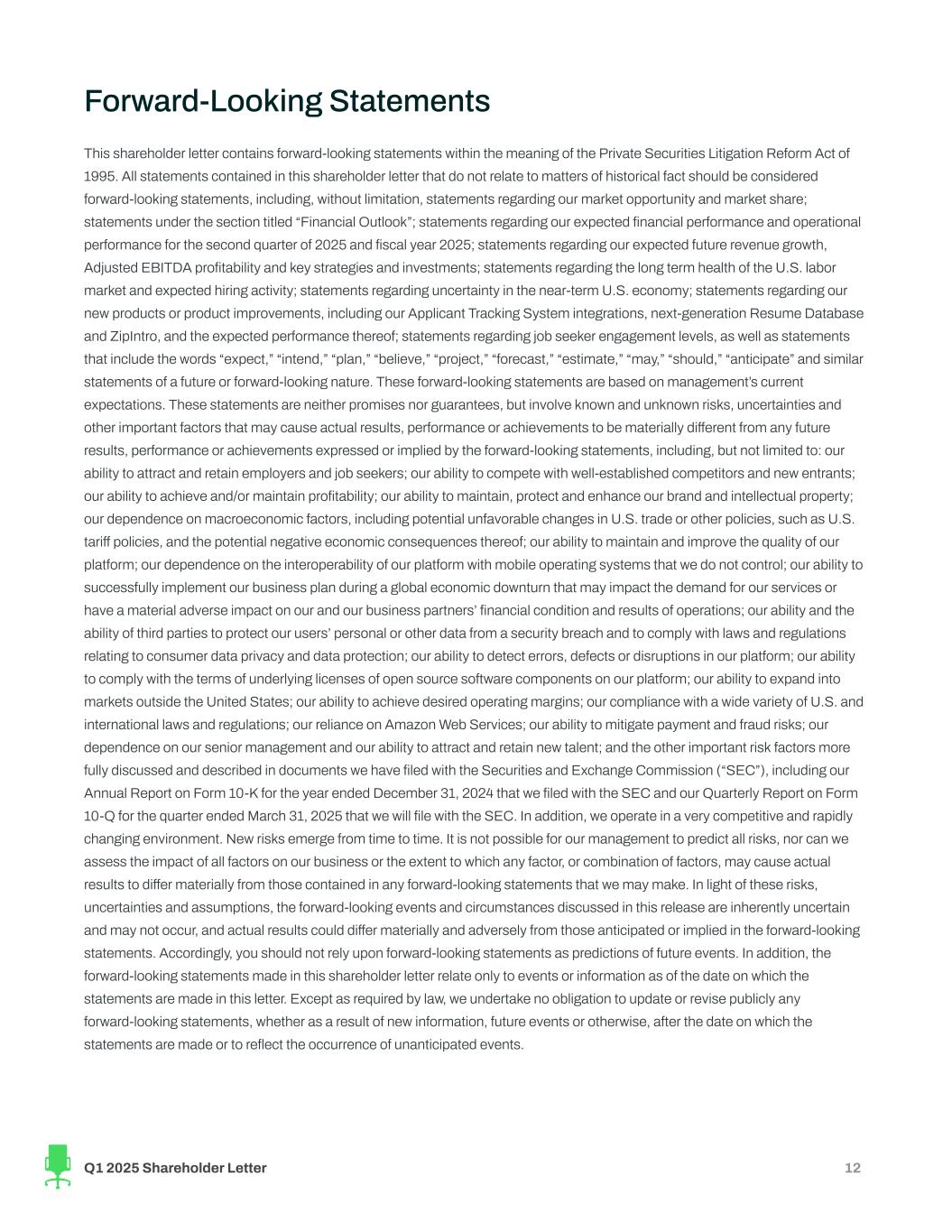 関税政策およびその潜在的な経済的悪影響、当社プラットフォームの品質を維持・向上させる能力、当社が管理しないモバイル・オペレーティング・システムとの相互運用性への依存、当社サービスの需要に影響を与えたり、当社およびビジネス・パートナーの財政状態や経営成績に重大な悪影響を及ぼす可能性のある世界的な景気後退時に、当社の事業計画を成功裏に実施する能力;当社および第三者がセキュリティ侵害からユーザーの個人情報またはその他のデータを保護し、消費者データのプライバシーおよびデータ保護に関する法律および規制を遵守する能力、当社プラットフォームのエラー、欠陥または中断を検出する能力、当社プラットフォーム上のオープンソースソフトウェアコンポーネントの基本ライセンス条項を遵守する能力、米国外の市場に進出する能力、望ましい営業利益率を達成する能力、米国および国際的な多種多様な法律および規制の遵守。また、当社が米国証券取引委員会に提出した2024年12月31日に終了した12ヶ月間の年次報告書(Form 10-K)および米国証券取引委員会に提出予定の2025年3月31日に終了した3ヶ月間の四半期報告書(Form 10-Q)の「リスク要因」の見出しで説明されているその他の重要な要因も含まれます。将来予想に関する記述が実現する保証はありません。あなたは、この日付の時点で唯一の期待を反映している将来の見通しに関する記述に過度に依存しないように注意してください。ZipRecruiterは、新しい情報、将来の発展、またはその他の結果にかかわらず、将来予想に関する記述を公に更新または見直す義務を負いません。