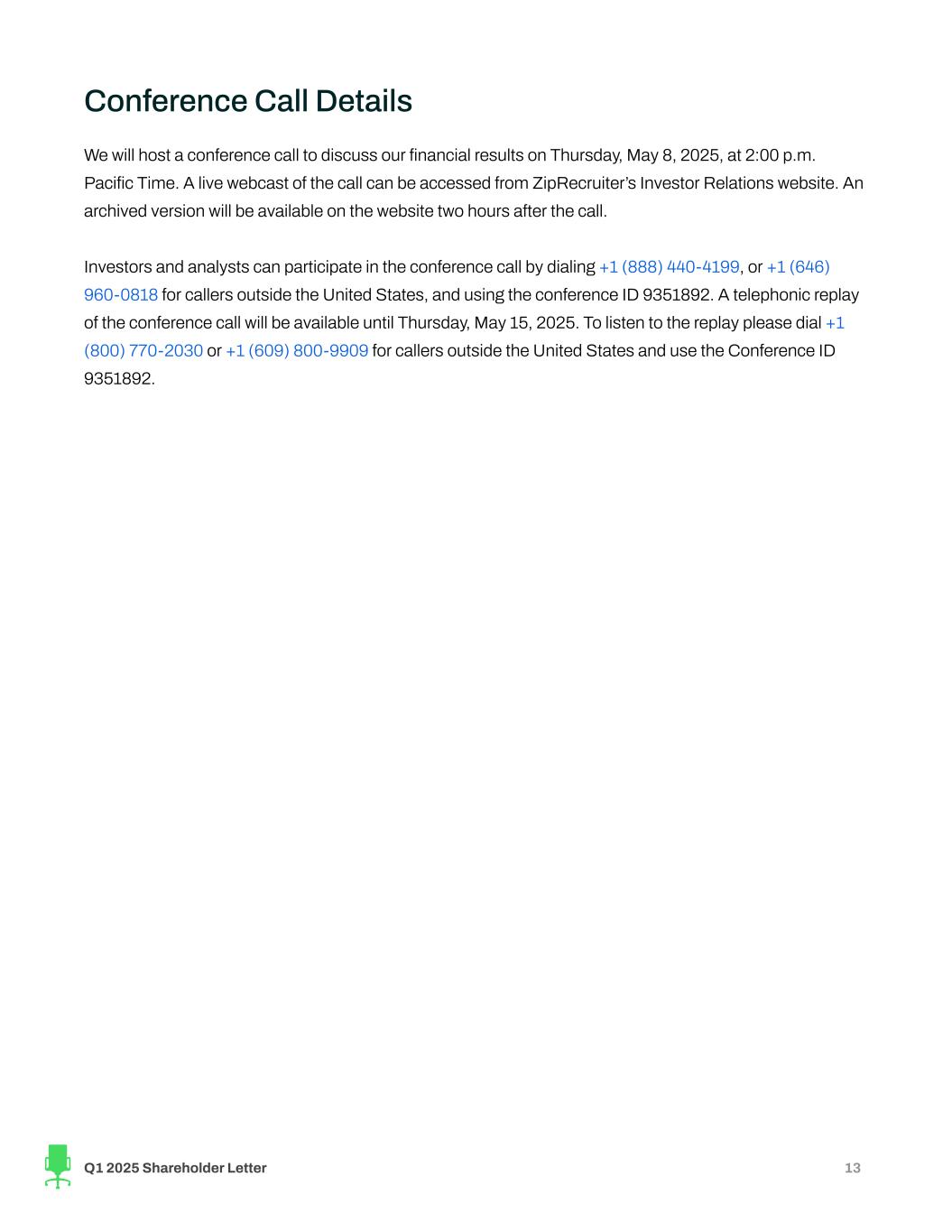 2025年5月8日、当社はウェブサイトのIRセクションに投資家向け補足資料を掲載しました。ZipRecruiterは、証券取引委員会への提出書類、当社ウェブサイトの投資家向けページ(www.ziprecruiter.com)、プレスリリース、公開電話会議、公開ウェブ放送、X(旧Twitter)フィード(@ZipRecruiter)、Facebookページ、LinkedInページを使用して投資家に重要な情報を発表します。したがって、ZipRecruiterは、投資家、メディア、および当社に関心のある他の人々が、そのような情報が重要な情報とみなされる可能性があるため、これらのチャネルで公開する情報を確認することをお勧めします。