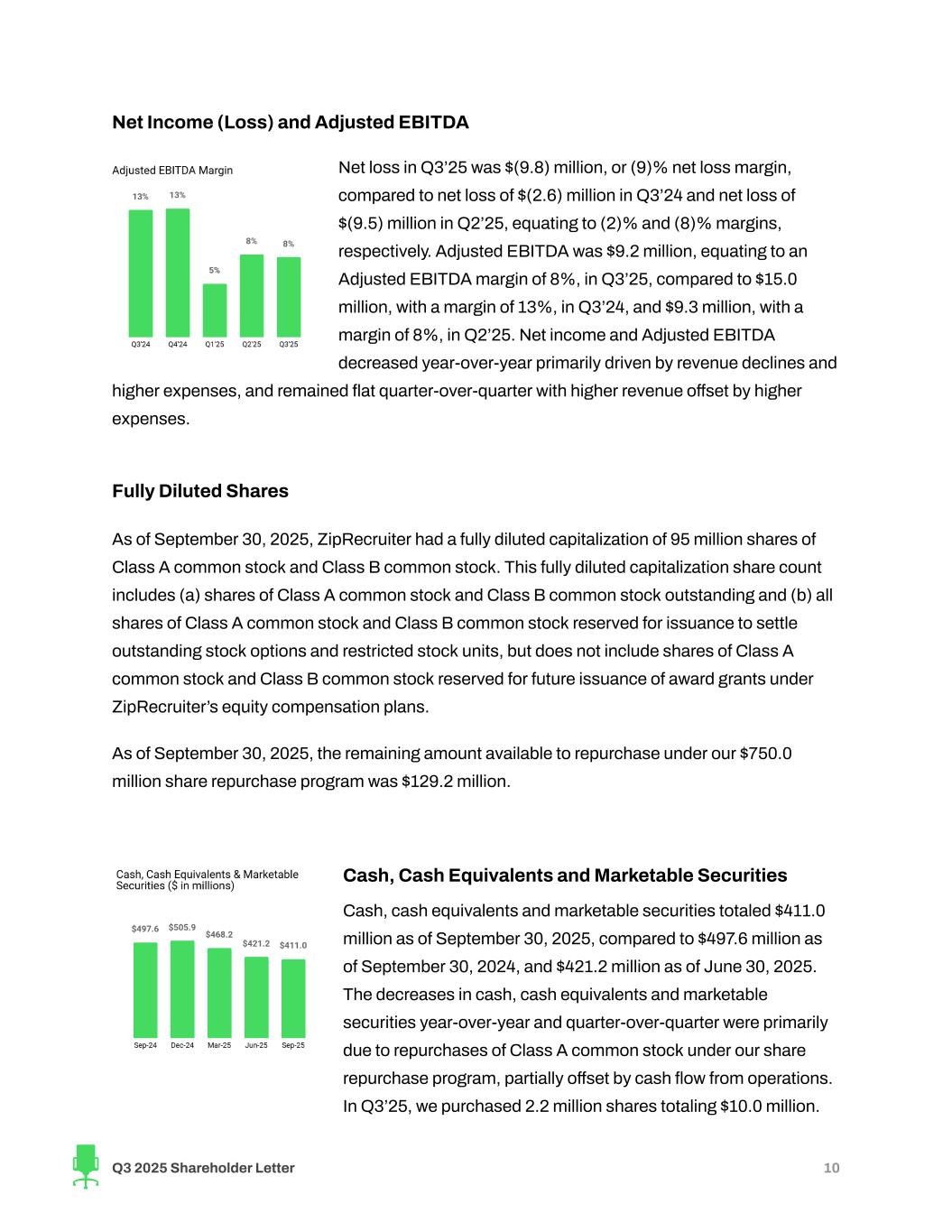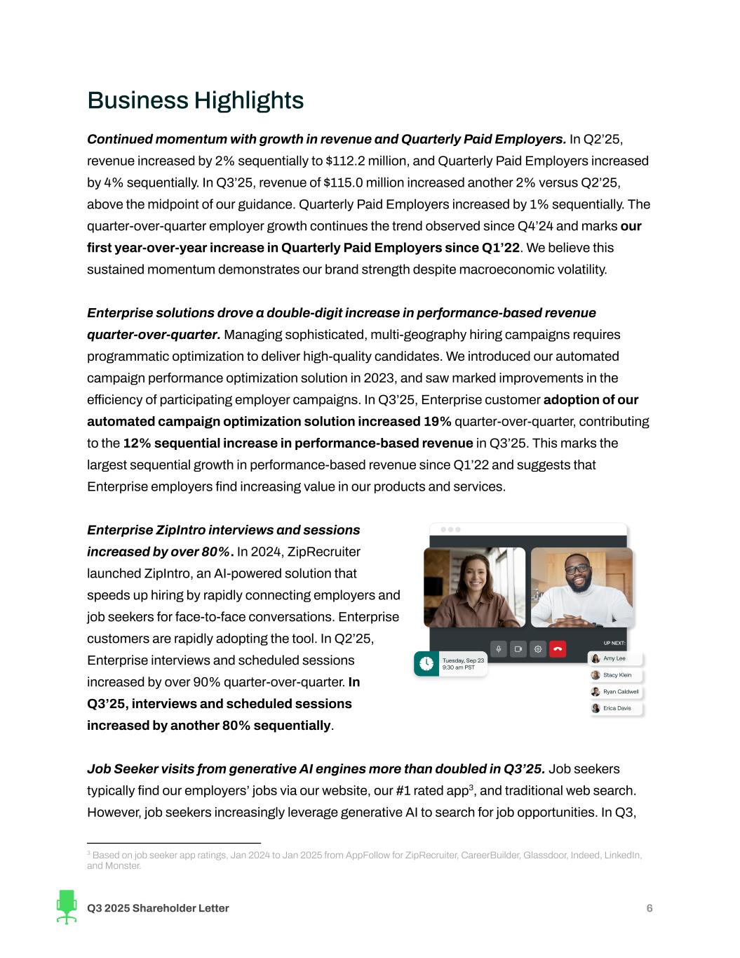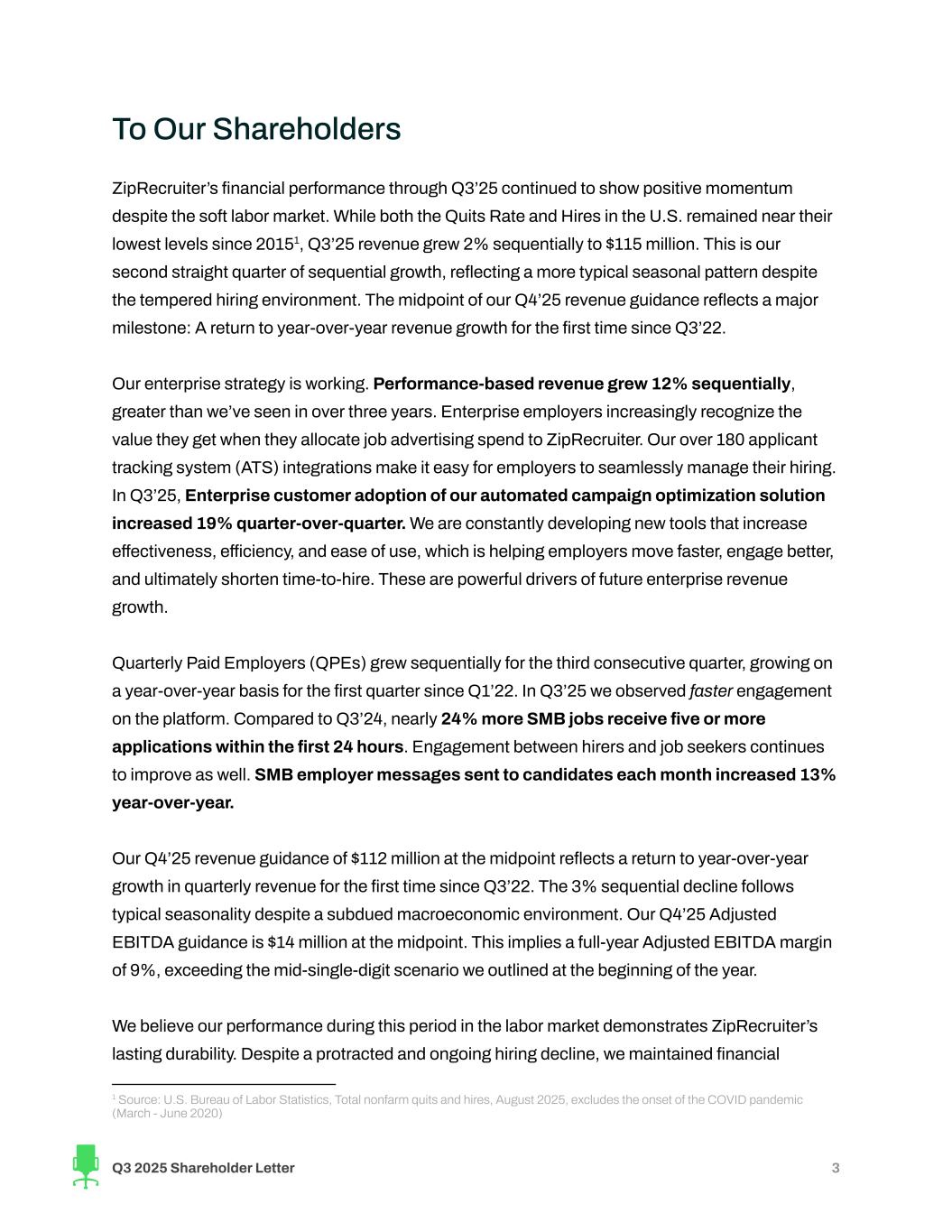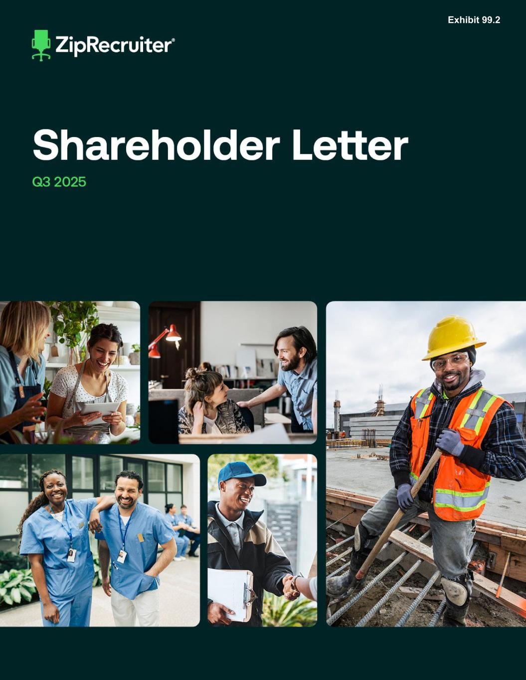 カリフォルニア州サンタモニカ(2025年11月5日) - 大手オンライン雇用市場のZipRecruiter®(NYSE:ZIP)は本日、2025年9月30日に終了した四半期の財務結果を発表しました。ZipRecruiterの完全な第3四半期の結果、財務ガイダンス、および経営陣のコメントは、投資家向けウェブサイトのinvestors.ziprecruiter.comの四半期決算ページにあるZipRecruiterの株主通信にアクセスすることで見つけることができます。