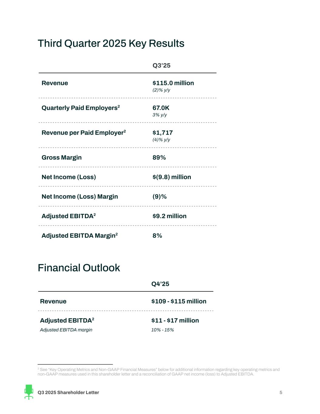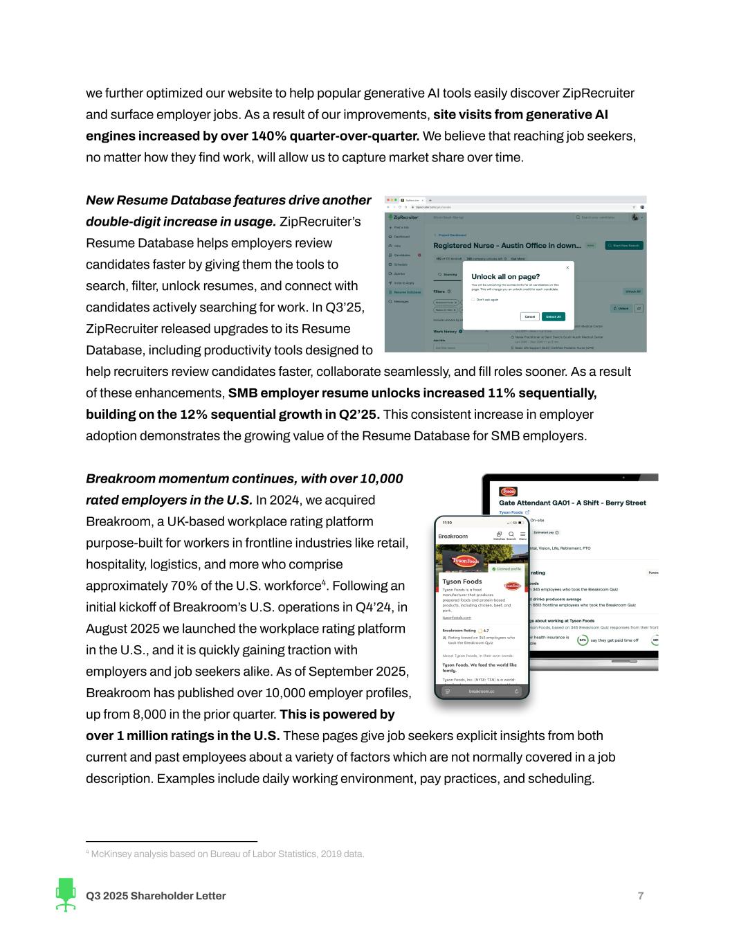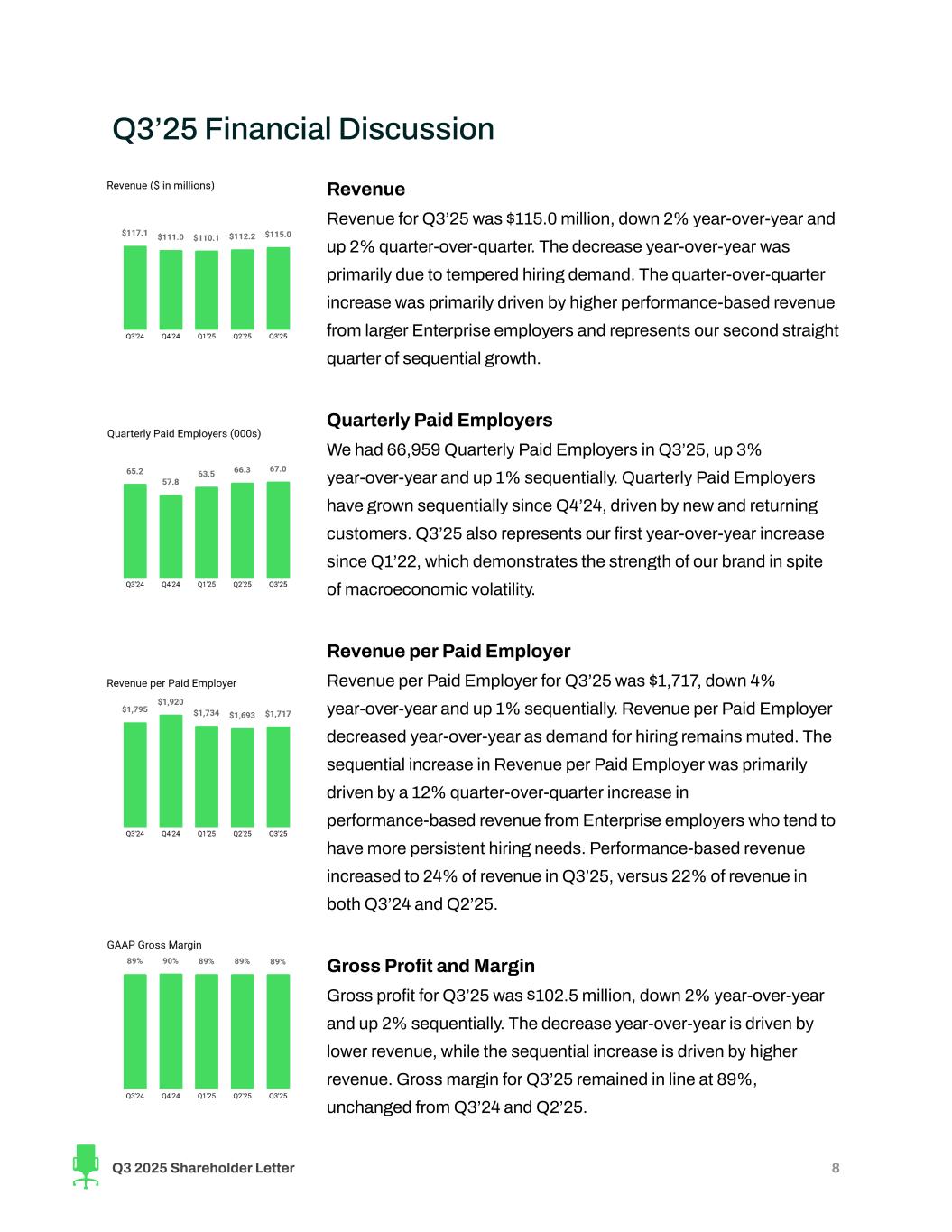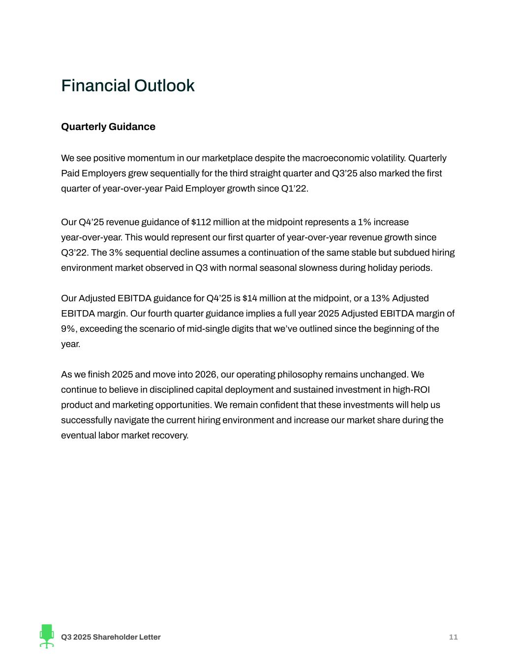 カリフォルニア州サンタモニカ(2025年11月5日) - 大手オンライン雇用市場のZipRecruiter®(NYSE:ZIP)は本日、2025年9月30日に終了した四半期の財務結果を発表しました。ZipRecruiterの完全な第3四半期の結果、財務ガイダンス、および経営陣のコメントは、投資家向けウェブサイトのinvestors.ziprecruiter.comの四半期決算ページにあるZipRecruiterの株主通信にアクセスすることで見つけることができます。
