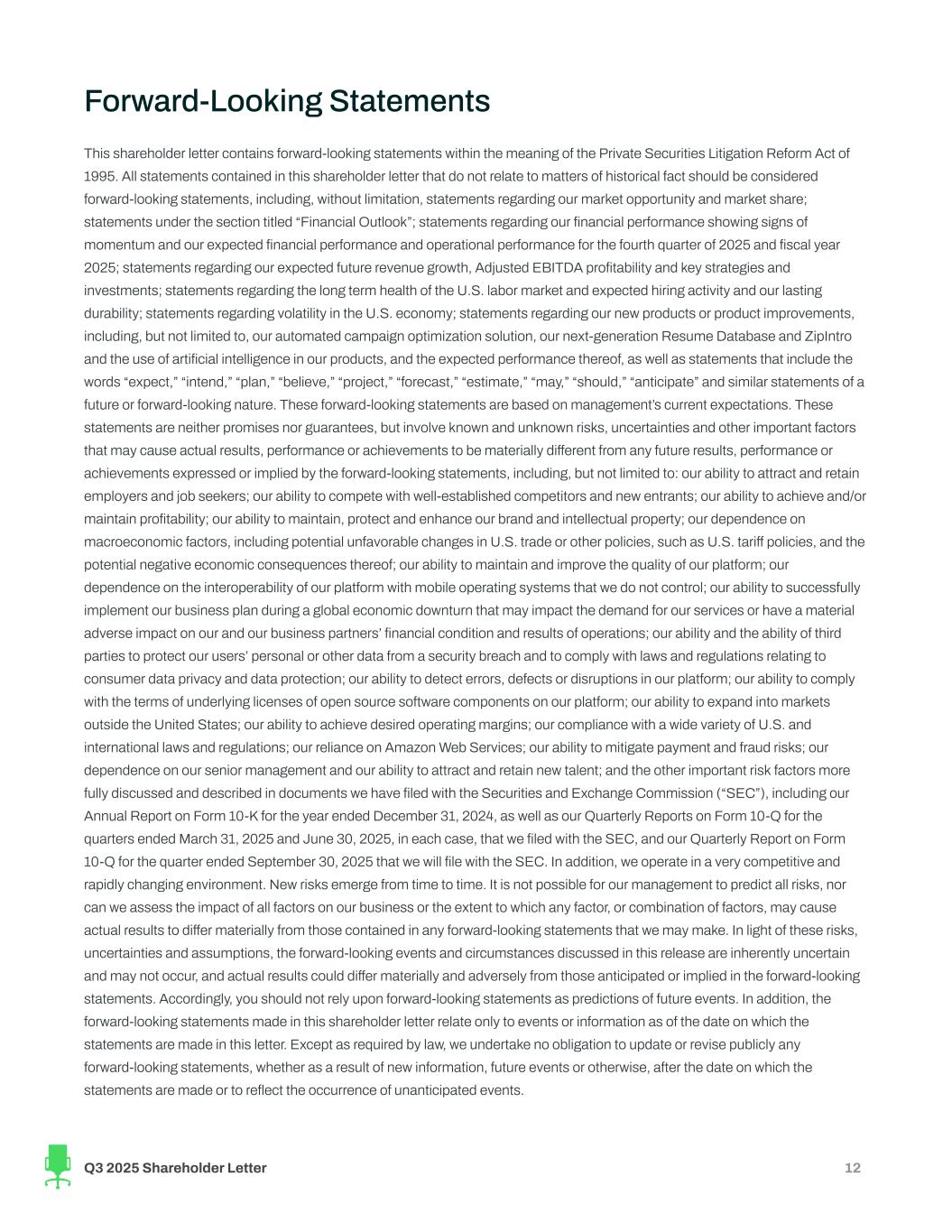 また、当社が米国証券取引委員会に提出した2024年12月31日に終了した12ヶ月間の年次報告書(Form 10-K)、2025年3月31日に終了した3ヶ月間の四半期報告書(Form 10-Q)、および2025年6月30日に終了した3ヶ月間の四半期報告書(Form 10-Q)、および2025年9月30日に終了した3ヶ月間の四半期報告書(Form 10-Q)の「リスク要因」の見出しで説明されているその他の重要な要因も含まれます。また、当社が米国証券取引委員会に提出する予定の2025年3月期および2025年6月期に関する四半期報告書(Form 10-Q)および2025年9月期に関する四半期報告書(Form 10-Q)にも記載されています。将来予想に関する記述が実現する保証はありません。あなたは、この日付の時点で唯一の期待を反映している将来の見通しに関する記述に過度に依存しないように注意してください。ZipRecruiterは、新しい情報、将来の発展、またはその他の結果にかかわらず、将来予想に関する記述を公に更新または見直す義務を負いません。