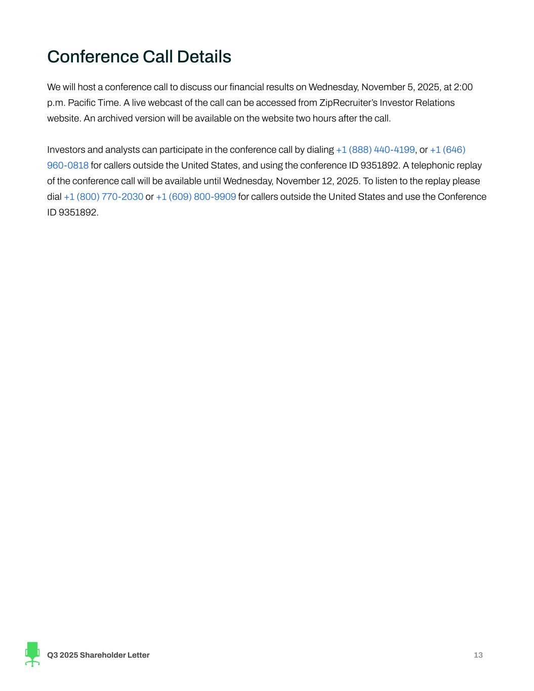 ZipRecruiter は株主通信と決算説明会の両方で非 GAAP 財務情報を参照しています。GAAPベースの業績と非GAAPベースの業績の調整は、このForm 8-KのCurrent Reportの別紙99.2として添付されている株主通信に記載されています。