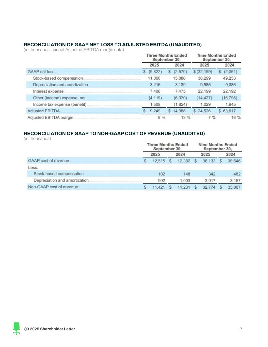 調整後EBITDAとは、支払利息、その他の収益(費用)(純額)、法人税等(利益)、減価償却費および償却費を控除する前の当期純利益(損失)を、株式報酬費用を控除するために調整したものである。調整後EBITDAマージンは、同期間の売上高に対する調整後EBITDAの割合を示しています。