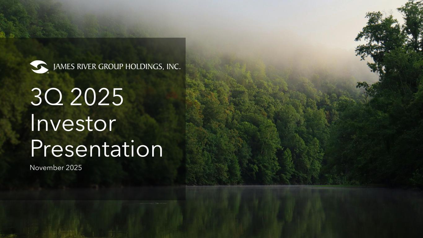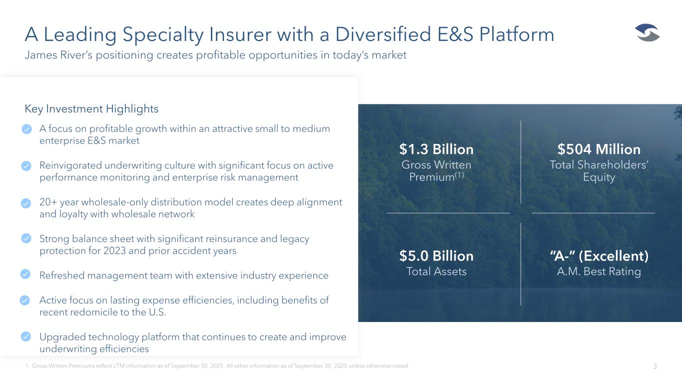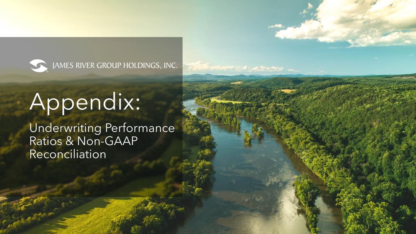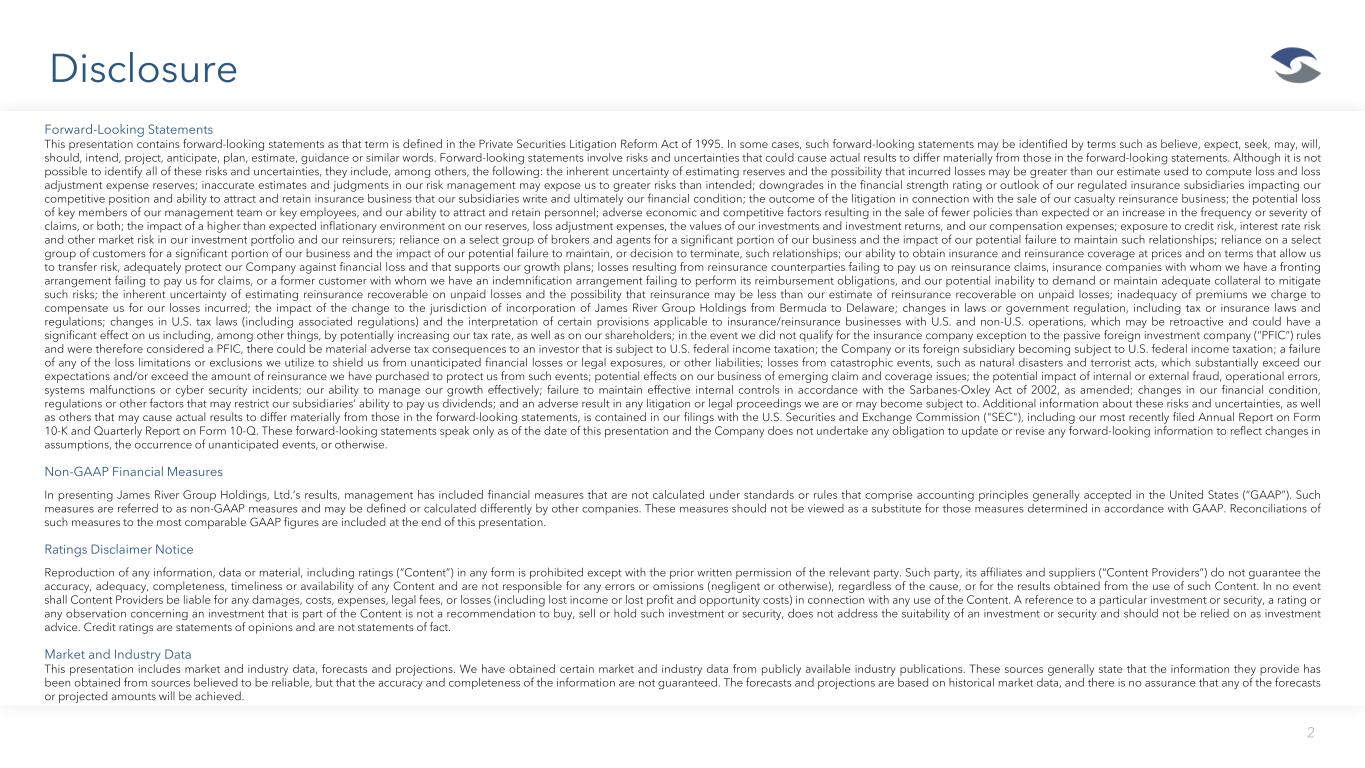 Disclosure 2 Forward-Looking Statements This presentation contains forward-looking statements as that term is defined in the Private Securities Litigation Reform Act of 1995. In some cases, such forward-looking statements may be identified by terms such as believe, expect, seek, may, will, should, intend, project, anticipate, plan, estimate, guidance or similar words. Forward-looking statements involve risks and uncertainties that could cause actual results to differ materially from those in the forward-looking statements. Although it is not possible to identify all of these risks and uncertainties, they include, among others, the following: the inherent uncertainty of estimating reserves and the possibility that incurred losses may be greater than our estimate used to compute loss and loss adjustment expense reserves; inaccurate estimates and judgments in our risk management may expose us to greater risks than intended; downgrades in the financial strength rating or outlook of our regulated insurance subsidiaries impacting our competitive position and ability to attract and retain insurance business that our subsidiaries write and ultimately our financial condition; the outcome of the litigation in connection with the sale of our casualty reinsurance business; the potential loss of key members of our management team or key employees, and our ability to attract and retain personnel; adverse economic and competitive factors resulting in the sale of fewer policies than expected or an increase in the frequency or severity of claims, or both; the impact of a higher than expected inflationary environment on our reserves, loss adjustment expenses, the values of our investments and investment returns, and our compensation expenses; exposure to credit risk, interest rate risk and other market risk in our investment portfolio and our reinsurers; reliance on a select group of brokers and agents for a significant portion of our business and the impact of our potential failure to maintain such relationships; reliance on a select group of customers for a significant portion of our business and the impact of our potential failure to maintain, or decision to terminate, such relationships; our ability to obtain insurance and reinsurance coverage at prices and on terms that allow us to transfer risk, adequately protect our Company against financial loss and that supports our growth plans; losses resulting from reinsurance counterparties failing to pay us on reinsurance claims, insurance companies with whom we have a fronting arrangement failing to pay us for claims, or a former customer with whom we have an indemnification arrangement failing to perform its reimbursement obligations, and our potential inability to demand or maintain adequate collateral to mitigate such risks; the inherent uncertainty of estimating reinsurance recoverable on unpaid losses and the possibility that reinsurance may be less than our estimate of reinsurance recoverable on unpaid losses; inadequacy of premiums we charge to compensate us for our losses incurred; the impact of the change to the jurisdiction of incorporation of James River Group Holdings from Bermuda to Delaware; changes in laws or government regulation, including tax or insurance laws and regulations; changes in U.S. tax laws (including associated regulations) and the interpretation of certain provisions applicable to insurance/reinsurance businesses with U.S. and non-U.S. operations, which may be retroactive and could have a significant effect on us including, among other things, by potentially increasing our tax rate, as well as on our shareholders; in the event we did not qualify for the insurance company exception to the passive foreign investment company (“PFIC”) rules and were therefore considered a PFIC, there could be material adverse tax consequences to an investor that is subject to U.S. federal income taxation; the Company or its foreign subsidiary becoming subject to U.S. federal income taxation; a failure of any of the loss limitations or exclusions we utilize to shield us from unanticipated financial losses or legal exposures, or other liabilities; losses from catastrophic events, such as natural disasters and terrorist acts, which substantially exceed our expectations and/or exceed the amount of reinsurance we have purchased to protect us from such events; potential effects on our business of emerging claim and coverage issues; the potential impact of internal or external fraud, operational errors, systems malfunctions or cyber security incidents; our ability to manage our growth effectively; failure to maintain effective internal controls in accordance with the Sarbanes-Oxley Act of 2002, as amended; changes in our financial condition, regulations or other factors that may restrict our subsidiaries’ ability to pay us dividends; and an adverse result in any litigation or legal proceedings we are or may become subject to. Additional information about these risks and uncertainties, as well as others that may cause actual results to differ materially from those in the forward-looking statements, is contained in our filings with the U.S. Securities and Exchange Commission ("SEC"), including our most recently filed Annual Report on Form 10-K and Quarterly Report on Form 10-Q. These forward-looking statements speak only as of the date of this presentation and the Company does not undertake any obligation to update or revise any forward-looking information to reflect changes in assumptions, the occurrence of unanticipated events, or otherwise. Non-GAAP Financial Measures In presenting James River Group Holdings, Ltd.’s results, management has included financial measures that are not calculated under standards or rules that comprise accounting principles generally accepted in the United States (“GAAP”). Such measures are referred to as non-GAAP measures and may be defined or calculated differently by other companies. These measures should not b