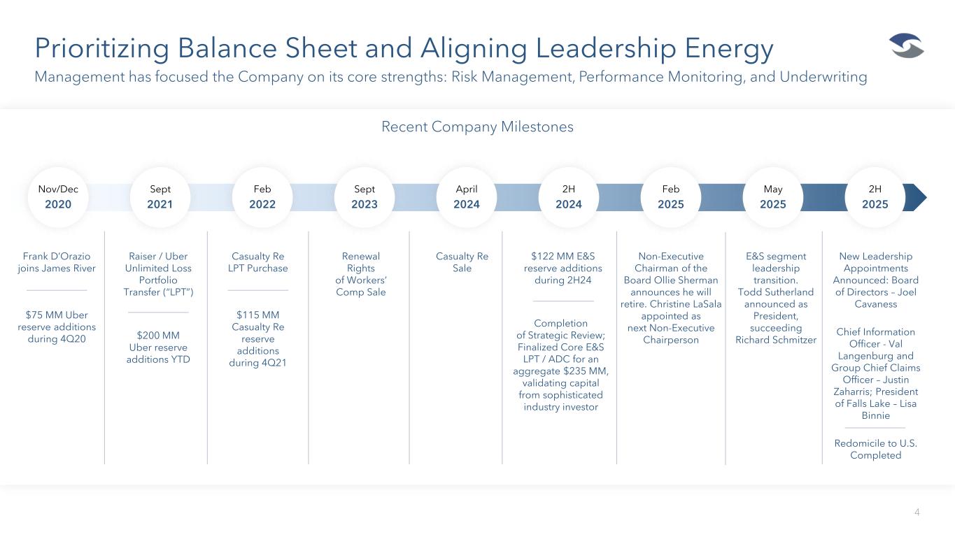 $1.3 Billion Gross Written Premium(1) $504 Million Total Shareholders’ Equity $5.0 Billion Total Assets “A-” (Excellent) A.M. Best Rating A Leading Specialty Insurer with a Diversified E&S Platform 3 James River’s positioning creates profitable opportunities in today’s market 1. Gross Written Premiums reflect LTM information as of September 30, 2025. All other information as of September 30, 2025 unless otherwise noted. Key Investment Highlights • A focus on profitable growth within an attractive small to medium enterprise E&S market • Reinvigorated underwriting culture with significant focus on active performance monitoring and enterprise risk management • 20+ year wholesale-only distribution model creates deep alignment and loyalty with wholesale network • Strong balance sheet with significant reinsurance and legacy protection for 2023 and prior accident years • Refreshed management team with extensive industry experience • Active focus on lasting expense efficiencies, including benefits of recent redomicile to the U.S. • Upgraded technology platform that continues to create and improve underwriting efficiencies