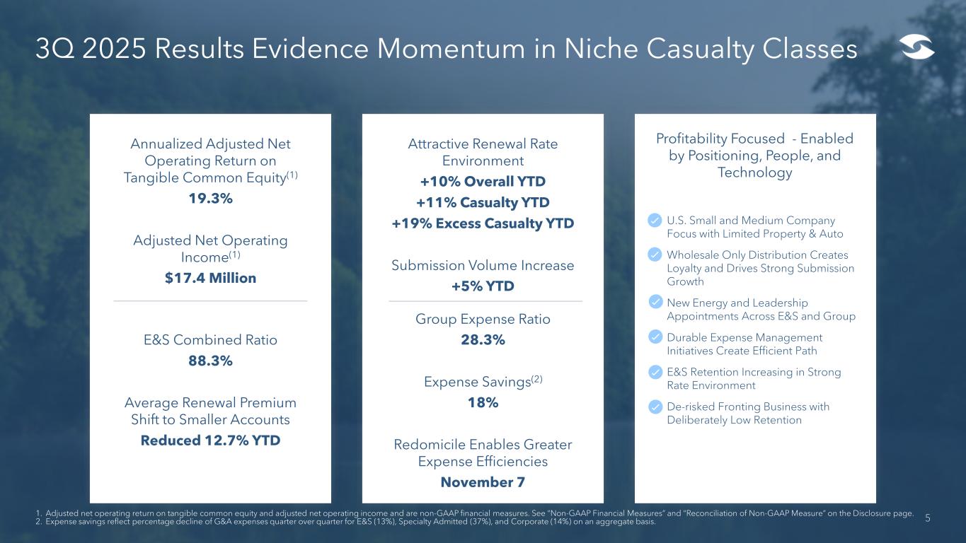 Prioritizing Balance Sheet and Aligning Leadership Energy 4 Management has focused the Company on its core strengths: Risk Management, Performance Monitoring, and Underwriting Sept 2023 Renewal Rights of Workers’ Comp Sale April 2024 Casualty Re Sale Sept 2021 Raiser / Uber Unlimited Loss Portfolio Transfer (“LPT”) $200 MM Uber reserve additions YTD Feb 2022 Casualty Re LPT Purchase $115 MM Casualty Re reserve additions during 4Q21 2H 2024 Completion of Strategic Review; Finalized Core E&S LPT / ADC for an aggregate $235 MM, validating capital from sophisticated industry investor $122 MM E&S reserve additions during 2H24 Nov/Dec 2020 $75 MM Uber reserve additions during 4Q20 Frank D’Orazio joins James River May 2025 E&S segment leadership transition. Todd Sutherland announced as President, succeeding Richard Schmitzer Feb 2025 Non-Executive Chairman of the Board Ollie Sherman announces he will retire. Christine LaSala appointed as next Non-Executive Chairperson Recent Company Milestones 2H 2025 New Leadership Appointments Announced: Board of Directors – Joel Cavaness Chief Information Officer - Val Langenburg and Group Chief Claims Officer – Justin Zaharris; President of Falls Lake – Lisa Binnie Redomicile to U.S. Completed