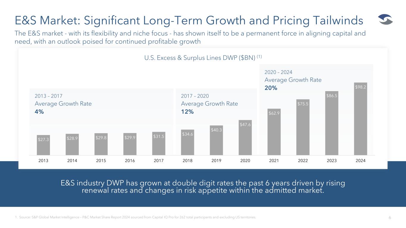 Profitability Focused - Enabled by Positioning, People, and Technology • U.S. Small and Medium Company Focus with Limited Property & Auto • Wholesale Only Distribution Creates Loyalty and Drives Strong Submission Growth • New Energy and Leadership Appointments Across E&S and Group • Durable Expense Management Initiatives Create Efficient Path • E&S Retention Increasing in Strong Rate Environment • De-risked Fronting Business with Deliberately Low Retention 5 3Q 2025 Results Evidence Momentum in Niche Casualty Classes Annualized Adjusted Net Operating Return on Tangible Common Equity(1) 19.3% Adjusted Net Operating Income(1) $17.4 Million E&S Combined Ratio 88.3% Average Renewal Premium Shift to Smaller Accounts Reduced 12.7% YTD Attractive Renewal Rate Environment +10% Overall YTD +11% Casualty YTD +19% Excess Casualty YTD Submission Volume Increase +5% YTD 1. Adjusted net operating return on tangible common equity and adjusted net operating income and are non-GAAP financial measures. See “Non-GAAP Financial Measures” and “Reconciliation of Non-GAAP Measure” on the Disclosure page. 2. Expense savings reflect percentage decline of G&A expenses quarter over quarter for E&S (13%), Specialty Admitted (37%), and Corporate (14%) on an aggregate basis. Group Expense Ratio 28.3% Expense Savings(2) 18% Redomicile Enables Greater Expense Efficiencies November 7