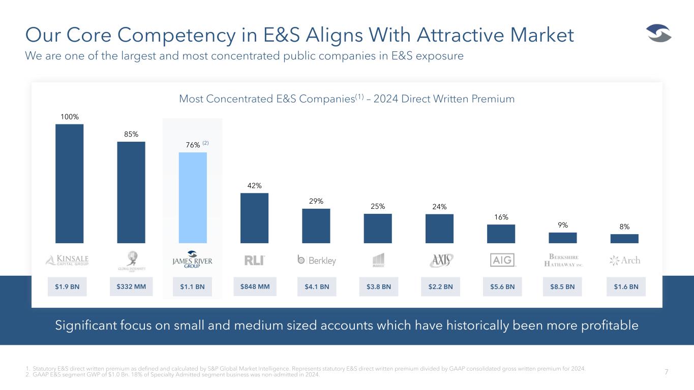 E&S Market: Significant Long-Term Growth and Pricing Tailwinds 6 The E&S market - with its flexibility and niche focus - has shown itself to be a permanent force in aligning capital and need, with an outlook poised for continued profitable growth 1. Source: S&P Global Market Intelligence – P&C Market Share Report 2024 sourced from Capital IQ Pro for 262 total participants and excluding US territories. E&S industry DWP has grown at double digit rates the past 6 years driven by rising renewal rates and changes in risk appetite within the admitted market. U.S. Excess & Surplus Lines DWP ($BN) (1) $27.3 $28.9 $29.8 $29.9 $31.5 $34.6 $40.3 $47.6 $62.9 $75.5 $86.5 $98.2 2013 2014 2015 2016 2017 2018 2019 2020 2021 2022 2023 2024 2013 – 2017 Average Growth Rate 4% 2017 – 2020 Average Growth Rate 12% 2020 – 2024 Average Growth Rate 20%