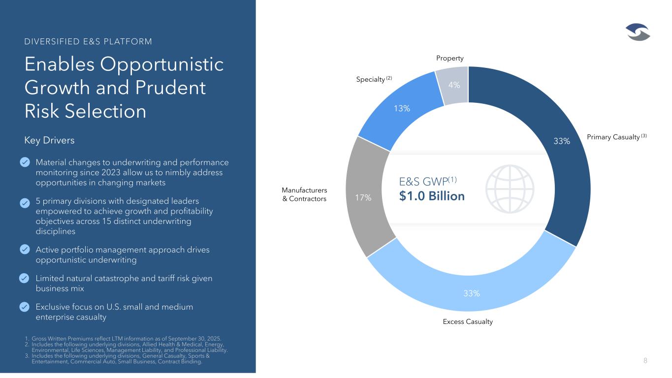Our Core Competency in E&S Aligns With Attractive Market 7 We are one of the largest and most concentrated public companies in E&S exposure 1. Statutory E&S direct written premium as defined and calculated by S&P Global Market Intelligence. Represents statutory E&S direct written premium divided by GAAP consolidated gross written premium for 2024. 2. GAAP E&S segment GWP of $1.0 Bn. 18% of Specialty Admitted segment business was non-admitted in 2024. 100% 85% 76% 42% 29% 25% 24% 16% 9% 8% Significant focus on small and medium sized accounts which have historically been more profitable Most Concentrated E&S Companies(1) – 2024 Direct Written Premium $1.9 BN $332 MM $1.1 BN $848 MM $4.1 BN $3.8 BN $2.2 BN $5.6 BN $8.5 BN $1.6 BN (2)