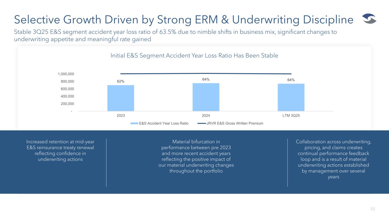 E&S submissions are growing and retention and hit ratios are within historical ranges despite underwriting repositioning Focus on small and medium accounts have historically been more profitable and less vulnerable to turnover. 34 consecutive quarters of increased renewal rate changes, compounded to 95%(2) for the quarter ending September 30, 2025 Attractive Rate and Strong E&S Submissions Create Opportunities 9 Rate and submission opportunities have enabled us to better target attractive lower premium accounts 1. Figures presented on an LTM basis as of September 30, 2025 unless otherwise noted. 2. Compounded rate change differs from previously published compounded rate change of 108% at 2Q25 due to updated actuarial methodologies. Casualty focused accounts for over 96% of E&S GWP 3Q25 casualty E&S renewal rate change of 6.1% Strength of the current casualty market provides robust tailwinds and a strong foundation for continued growth across our diverse underwriting divisions 10% YTD ‘25 Renewal Rate Change (13%) Average Renewal Premium Per Policy 5% YTD ‘25 Submission Growth 7% YTD ‘25 New Quote Growth $699 $834 $921 $1,007 $1,017 $1,004 23% 38% 53% 67% 82% 95% 2020 2021 2022 2023 2024 LTM 3Q25 E&S ex. Uber GWP ($ MM) Compounded Rate Change