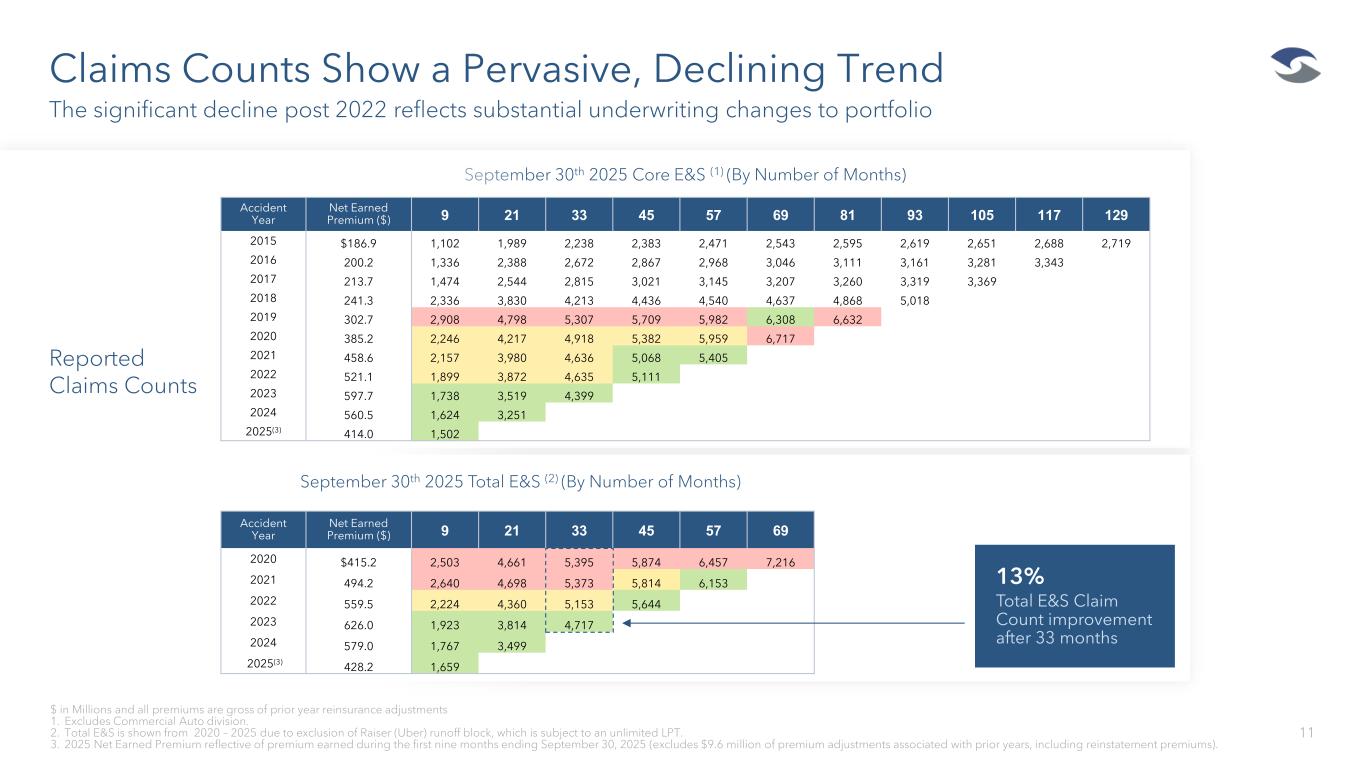 Selective Growth Driven by Strong ERM & Underwriting Discipline 10 Stable 3Q25 E&S segment accident year loss ratio of 63.5% due to nimble shifts in business mix, significant changes to underwriting appetite and meaningful rate gained Initial E&S Segment Accident Year Loss Ratio Has Been Stable Increased retention at mid-year E&S reinsurance treaty renewal reflecting confidence in underwriting actions Material bifurcation in performance between pre 2023 and more recent accident years reflecting the positive impact of our material underwriting changes throughout the portfolio 62% 64% 64% - 200,000 400,000 600,000 800,000 1,000,000 2023 2024 LTM 3Q25 E&S Accident Year Loss Ratio JRVR E&S Gross Written Premium Collaboration across underwriting, pricing, and claims creates continual performance feedback loop and is a result of material underwriting actions established by management over several years
