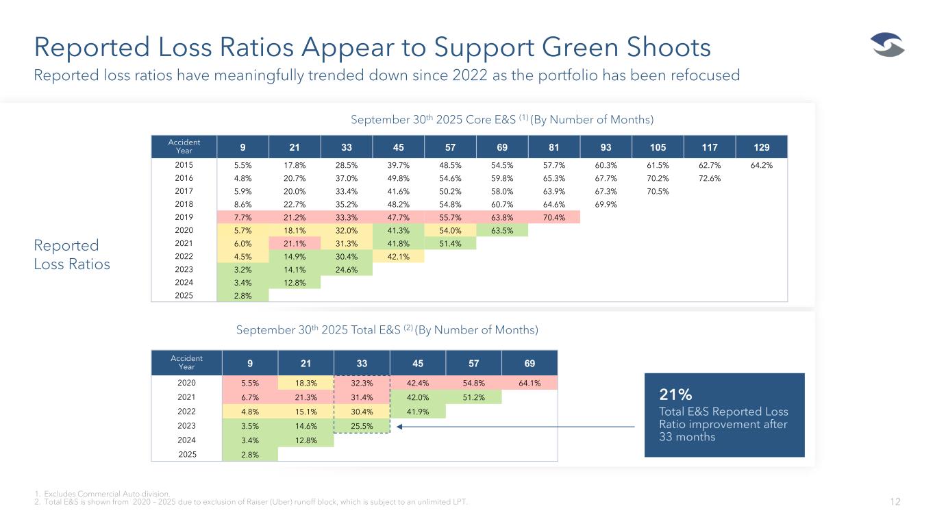 September 30th 2025 Core E&S (1) (By Number of Months) Claims Counts Show a Pervasive, Declining Trend 11 The significant decline post 2022 reflects substantial underwriting changes to portfolio $ in Millions and all premiums are gross of prior year reinsurance adjustments 1. Excludes Commercial Auto division. 2. Total E&S is shown from 2020 – 2025 due to exclusion of Raiser (Uber) runoff block, which is subject to an unlimited LPT. 3. 2025 Net Earned Premium reflective of premium earned during the first nine months ending September 30, 2025 (excludes $9.6 million of premium adjustments associated with prior years, including reinstatement premiums). September 30th 2025 Total E&S (2) (By Number of Months) Accident Year Net Earned Premium ($) 9 21 33 45 57 69 81 93 105 117 129 2015 $186.9 1,102 1,989 2,238 2,383 2,471 2,543 2,595 2,619 2,651 2,688 2,719 2016 200.2 1,336 2,388 2,672 2,867 2,968 3,046 3,111 3,161 3,281 3,343 2017 213.7 1,474 2,544 2,815 3,021 3,145 3,207 3,260 3,319 3,369 2018 241.3 2,336 3,830 4,213 4,436 4,540 4,637 4,868 5,018 2019 302.7 2,908 4,798 5,307 5,709 5,982 6,308 6,632 2020 385.2 2,246 4,217 4,918 5,382 5,959 6,717 2021 458.6 2,157 3,980 4,636 5,068 5,405 2022 521.1 1,899 3,872 4,635 5,111 2023 597.7 1,738 3,519 4,399 2024 560.5 1,624 3,251 2025(3) 414.0 1,502 Accident Year Net Earned Premium ($) 9 21 33 45 57 69 2020 $415.2 2,503 4,661 5,395 5,874 6,457 7,216 2021 494.2 2,640 4,698 5,373 5,814 6,153 2022 559.5 2,224 4,360 5,153 5,644 2023 626.0 1,923 3,814 4,717 2024 579.0 1,767 3,499 2025(3) 428.2 1,659 13% Total E&S Claim Count improvement after 33 months Reported Claims Counts