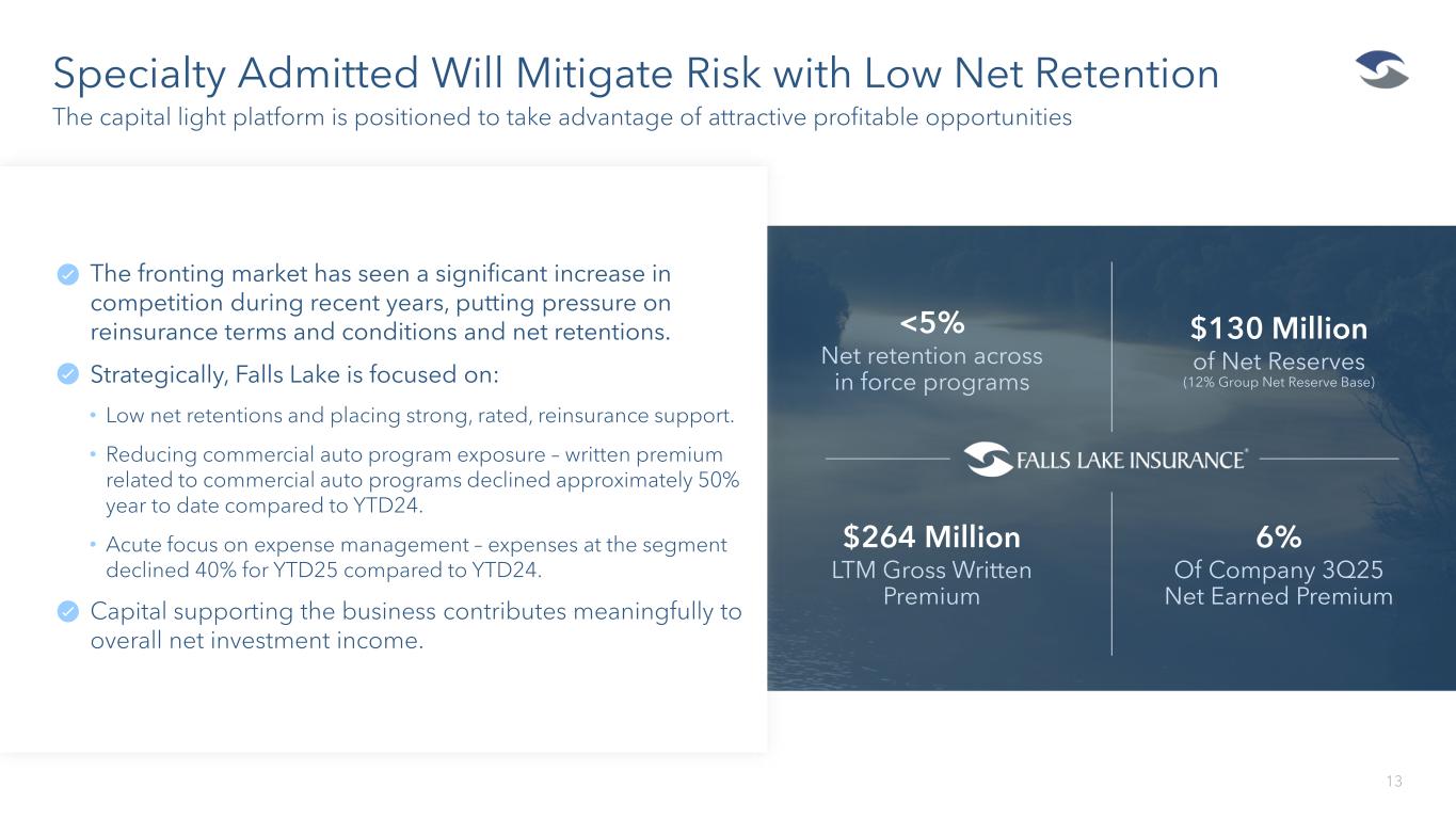 September 30th 2025 Core E&S (1) (By Number of Months) Reported Loss Ratios Appear to Support Green Shoots 12 Reported loss ratios have meaningfully trended down since 2022 as the portfolio has been refocused 1. Excludes Commercial Auto division. 2. Total E&S is shown from 2020 – 2025 due to exclusion of Raiser (Uber) runoff block, which is subject to an unlimited LPT. September 30th 2025 Total E&S (2) (By Number of Months) Accident Year 9 21 33 45 57 69 81 93 105 117 129 2015 5.5% 17.8% 28.5% 39.7% 48.5% 54.5% 57.7% 60.3% 61.5% 62.7% 64.2% 2016 4.8% 20.7% 37.0% 49.8% 54.6% 59.8% 65.3% 67.7% 70.2% 72.6% 2017 5.9% 20.0% 33.4% 41.6% 50.2% 58.0% 63.9% 67.3% 70.5% 2018 8.6% 22.7% 35.2% 48.2% 54.8% 60.7% 64.6% 69.9% 2019 7.7% 21.2% 33.3% 47.7% 55.7% 63.8% 70.4% 2020 5.7% 18.1% 32.0% 41.3% 54.0% 63.5% 2021 6.0% 21.1% 31.3% 41.8% 51.4% 2022 4.5% 14.9% 30.4% 42.1% 2023 3.2% 14.1% 24.6% 2024 3.4% 12.8% 2025 2.8% Accident Year 9 21 33 45 57 69 2020 5.5% 18.3% 32.3% 42.4% 54.8% 64.1% 2021 6.7% 21.3% 31.4% 42.0% 51.2% 2022 4.8% 15.1% 30.4% 41.9% 2023 3.5% 14.6% 25.5% 2024 3.4% 12.8% 2025 2.8% 21% Total E&S Reported Loss Ratio improvement after 33 months Reported Loss Ratios